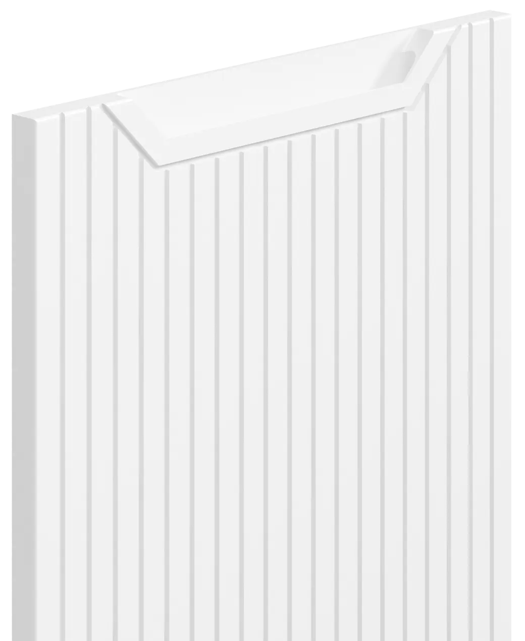 На поверхности фасада выполнена фрезеровка с крупным шагом, что придает мебели более дорогой и изысканный вид. Здесь же предусмотрена врезная ручка, обеспечивающая удобный захват.