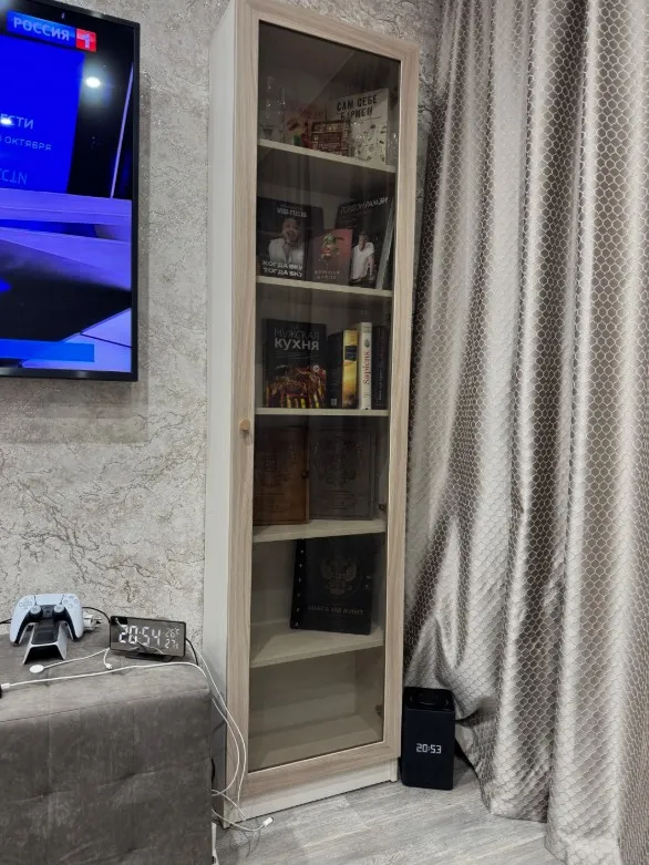 По работе менеджера и доставке - всё отлично. Всё подробно обговорили, изготовили примерно за 2 недели, доставили в срок, звонили заранее, на месте проверили целостность стекла. По стеллажу: удобный, выглядит хорошо, собирал где-то часа 3 без трудностей, по инструкции всё понятно. Все детали вырезаны аккуратно, никаких дефектов, отверстия сделаны точно, всё встало ровно, только петли немного подкорректировал. Что не понравилось: цвет "молочный дуб" - визуально различимы широкие розоватые и желтоватые чередующиеся полосы, не особо красиво (как будто в принтере одна краска заканчивается). Может, цвет и должен быть таким, но несколько лет назад покупал тумбочку - у нее тот же "молочный дуб" был вполне равномерным. Из желаемого - хотелось бы возможность выбрать фасад в цвет корпуса, и заднюю стенку с покрытием под дерево, как в икеевских шкафах. Мелочь - не хватило одного самореза (использовал 4 для уголка крепления к стене, остальные на петли).