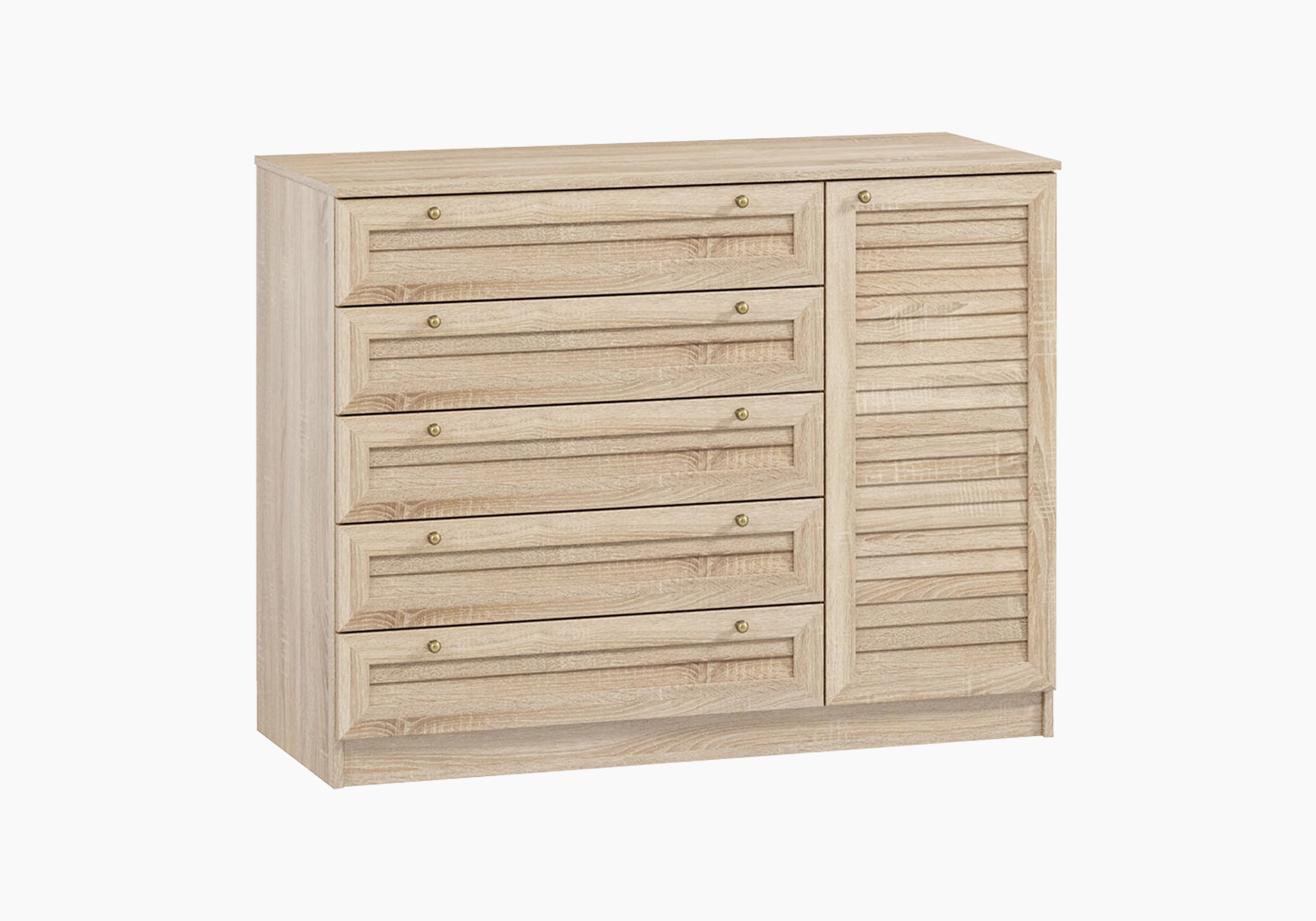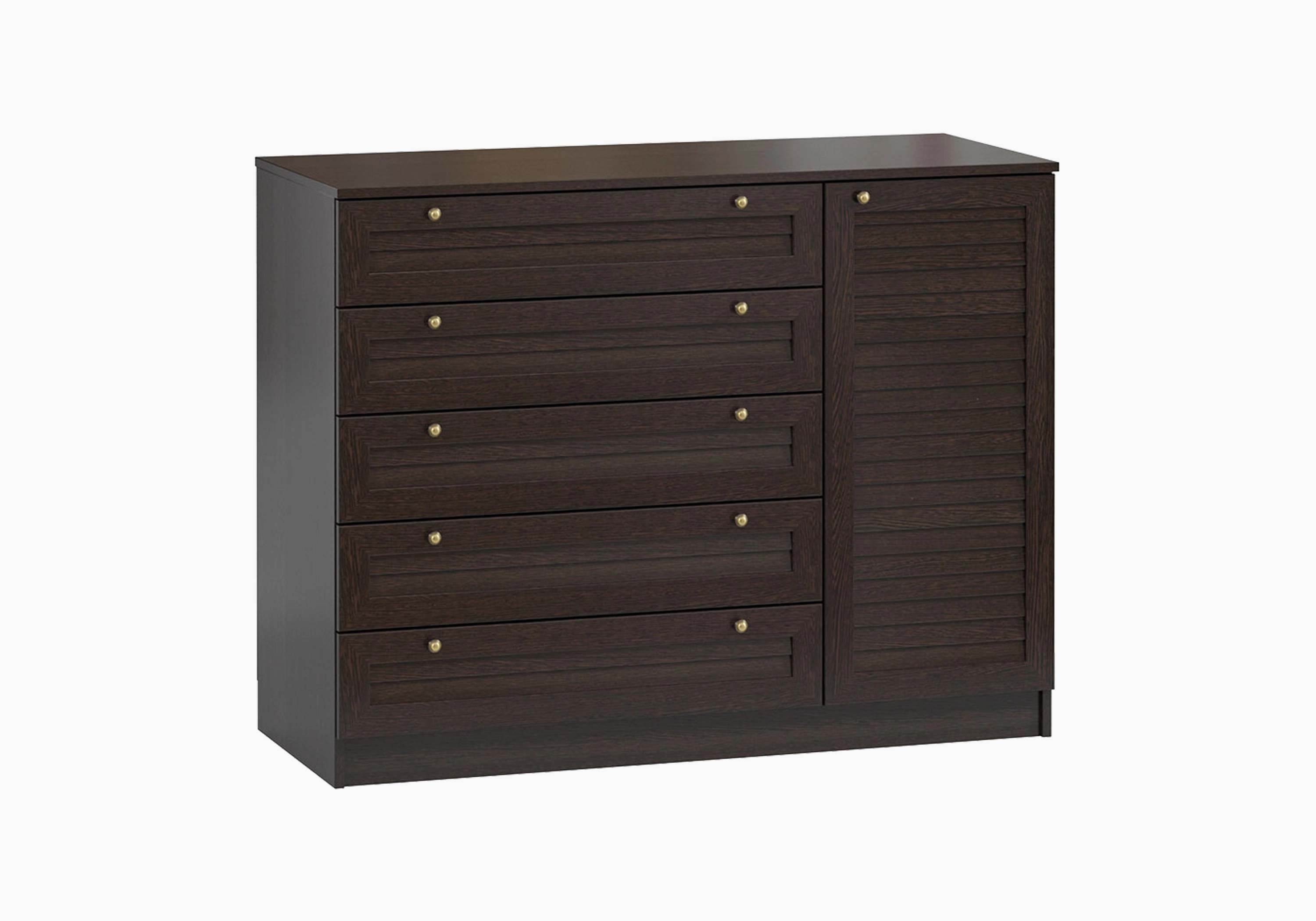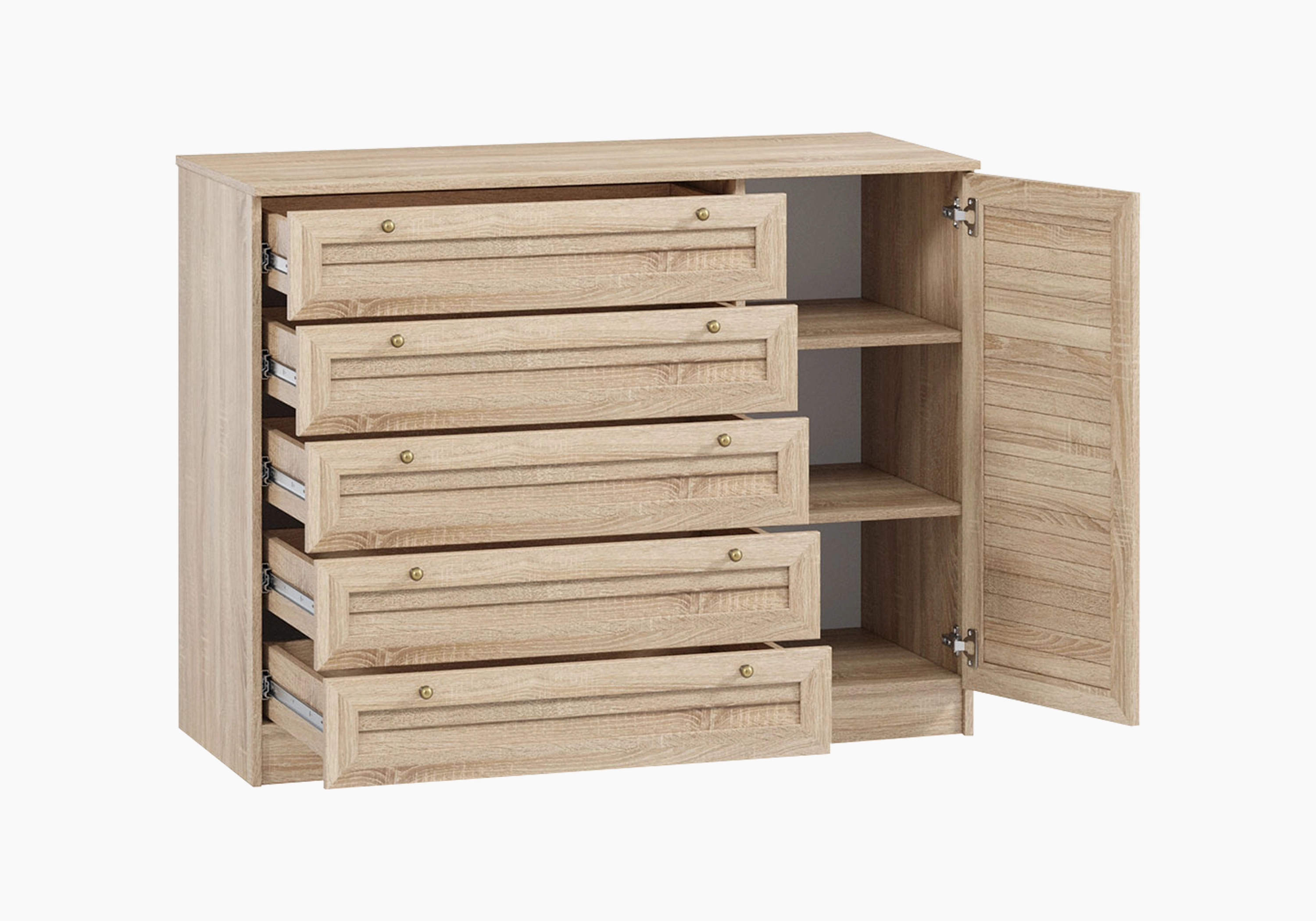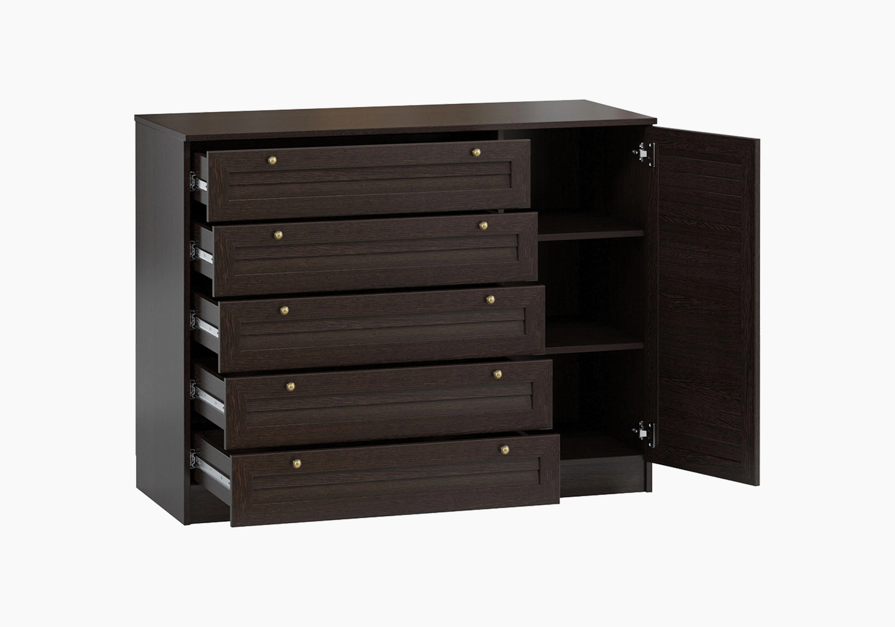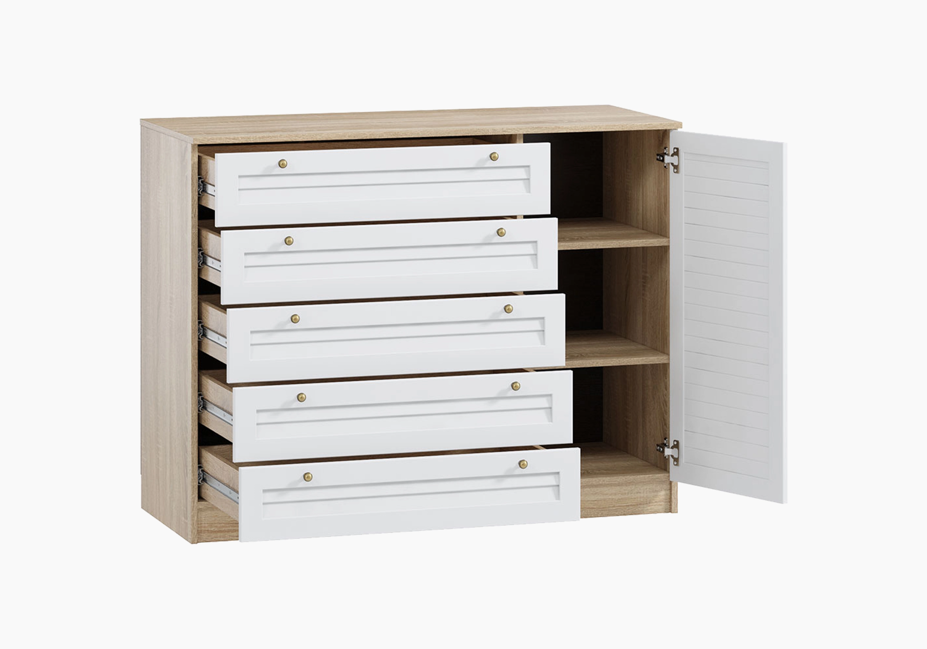 Система хранения состоит из пяти выдвижных ящиков и распашного отделения с двумя полками. Встроенные шариковые направляющие способствуют бесшумному и плавному закрыванию. Закрытое основание улучшает устойчивость мебели и упрощает уборку.