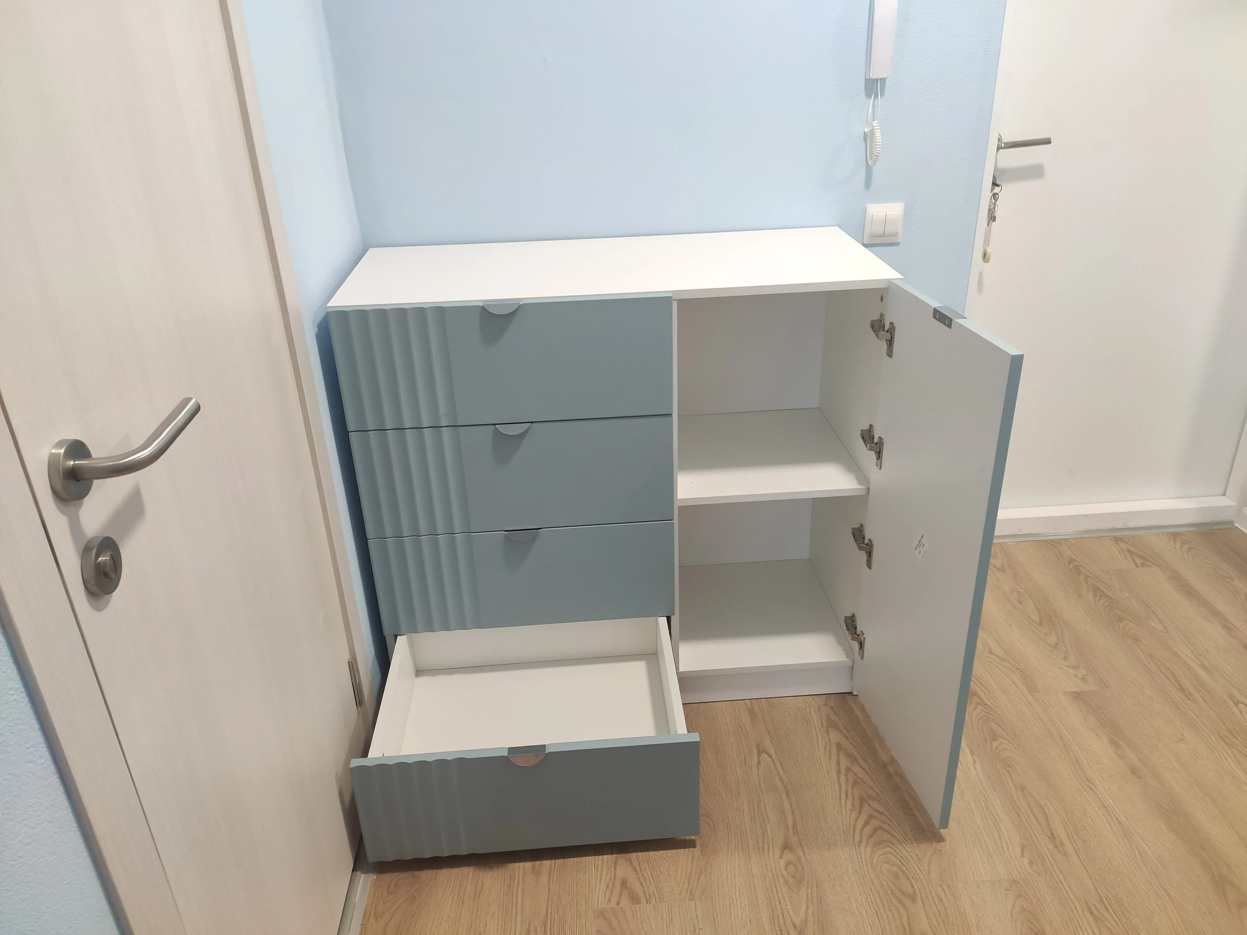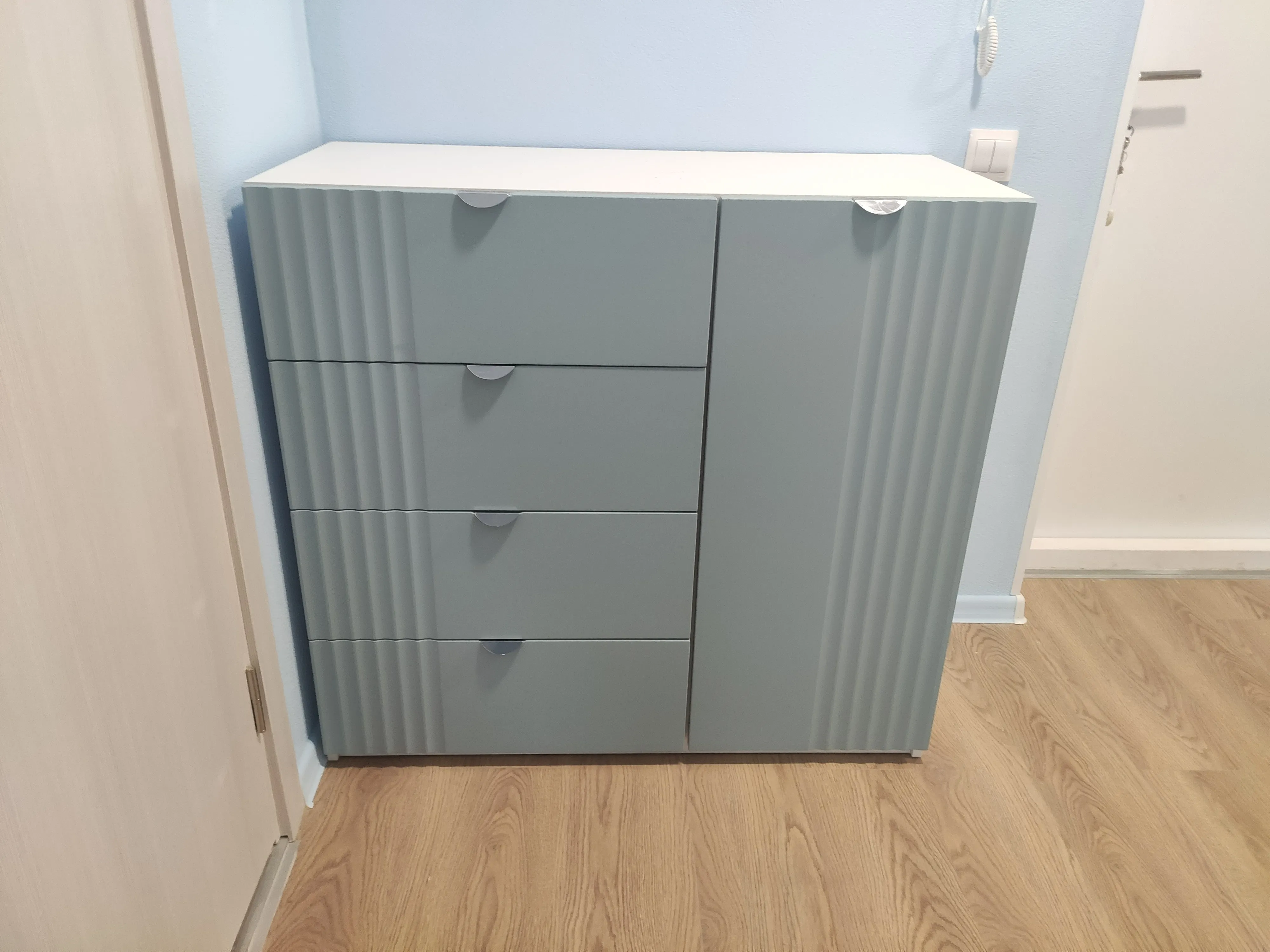 Для ценителей порядка такой комод станет удачным решением как для спальной, так и для гостиной комнат. Четыре вместительных ящика оснащены шариковыми направляющими, обеспечивающими плотное и бесшумное закрывание. За дверцей расположены два просторных места, разделенные полкой.