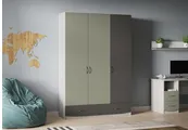 В состав набора входят: кровать, письменный стол, стеллаж и трехдверный распашной шкаф.