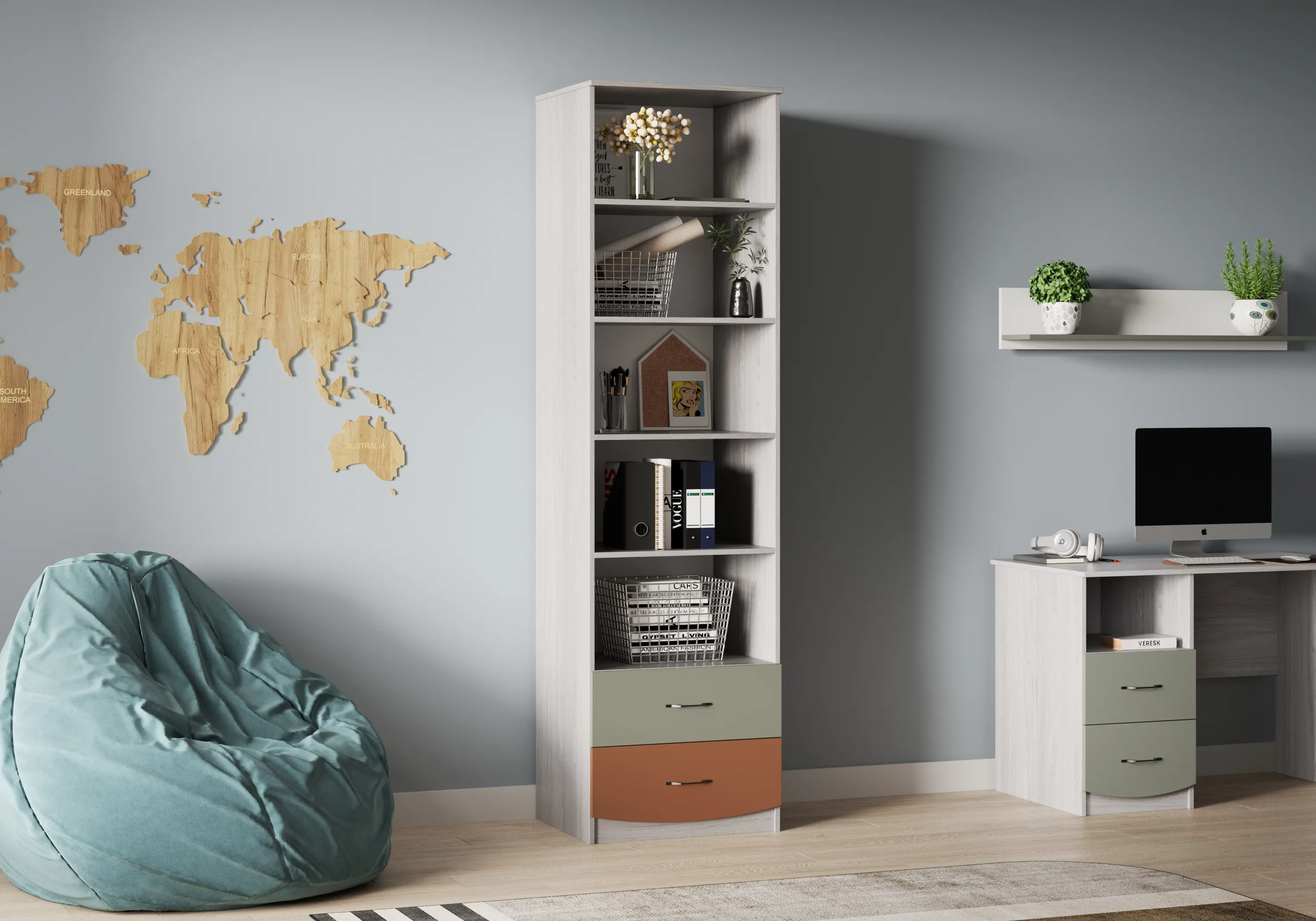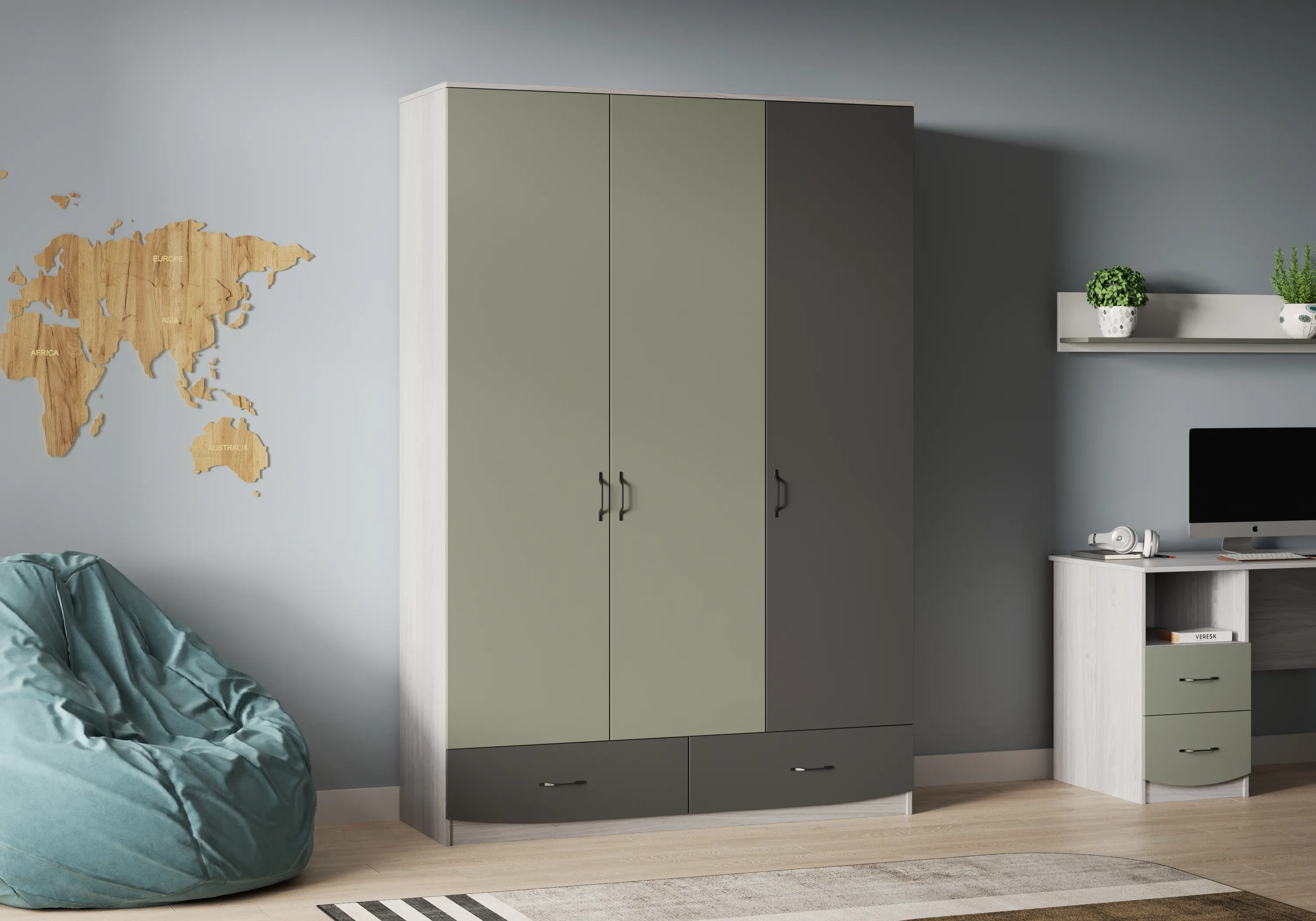 В состав набора входят: кровать, письменный стол, стеллаж и трехдверный распашной шкаф.