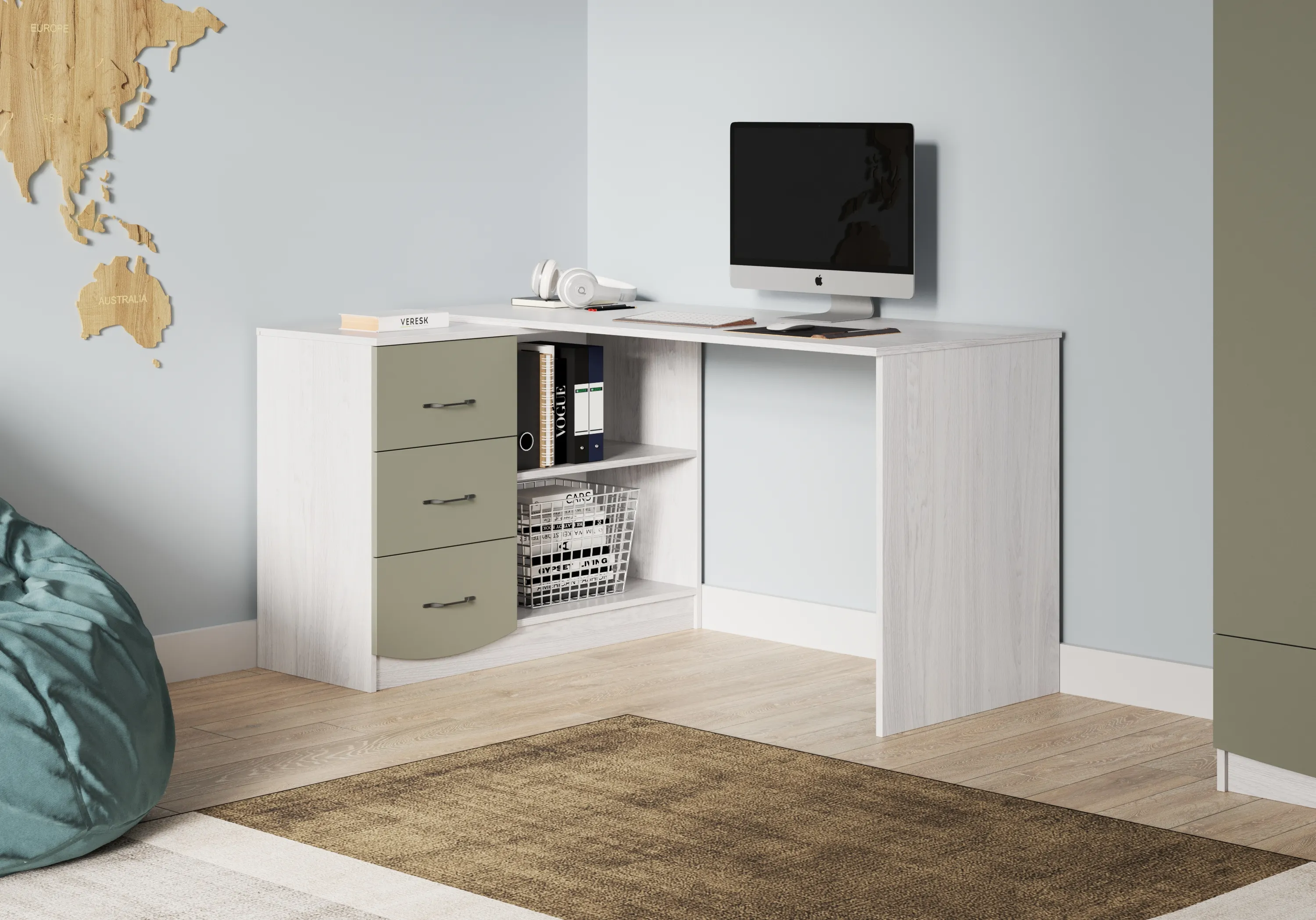Стол имеет угловую конструкцию и оснащен тремя выдвижными вместительными ящиками. Ящики плавно и бесшумно выдвигаются за счет встроенных направляющих.