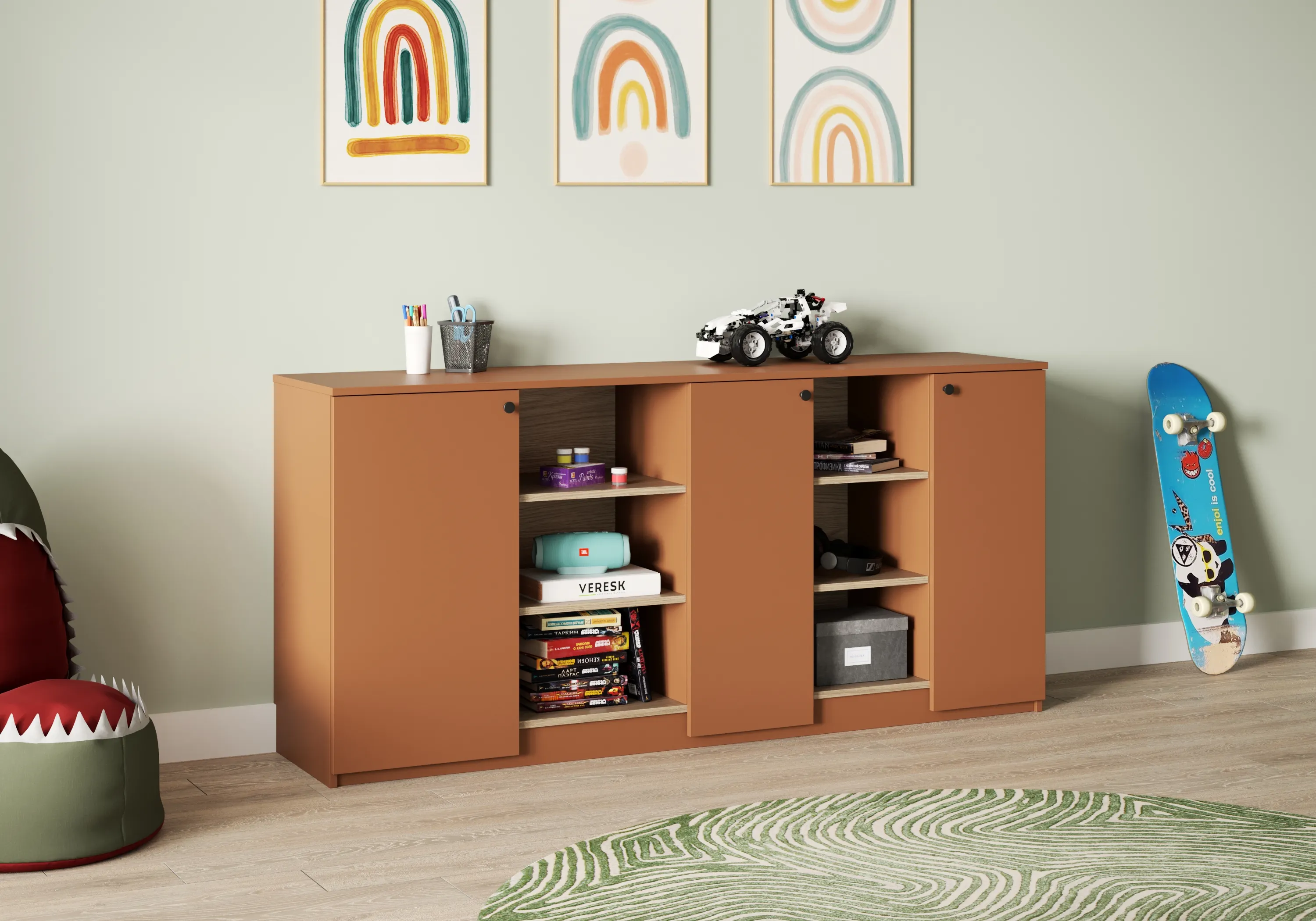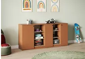 Интегрированные открытые ниши комода помогут содержать в порядке книги, коллекции и прочие мелкие вещи. У конструкции также есть закрытые распашными дверцами полки.
