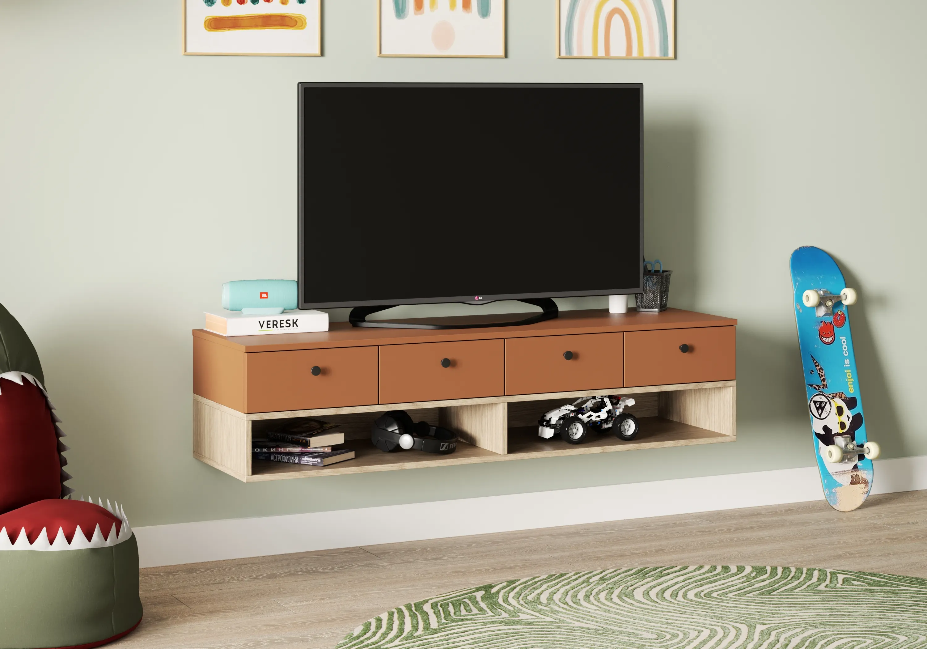 ТВ-тумба навесная — это стильное и современное решение для размещения большого плазменного телевизора и акустической системы. Для зарядных устройств, игрушек и других нужных мелочей предусмотрены выдвижные ящики, оснащенные шариковыми направляющими. Пульты, наушники и декоративные украшения органично уместятся на открытых нишах.