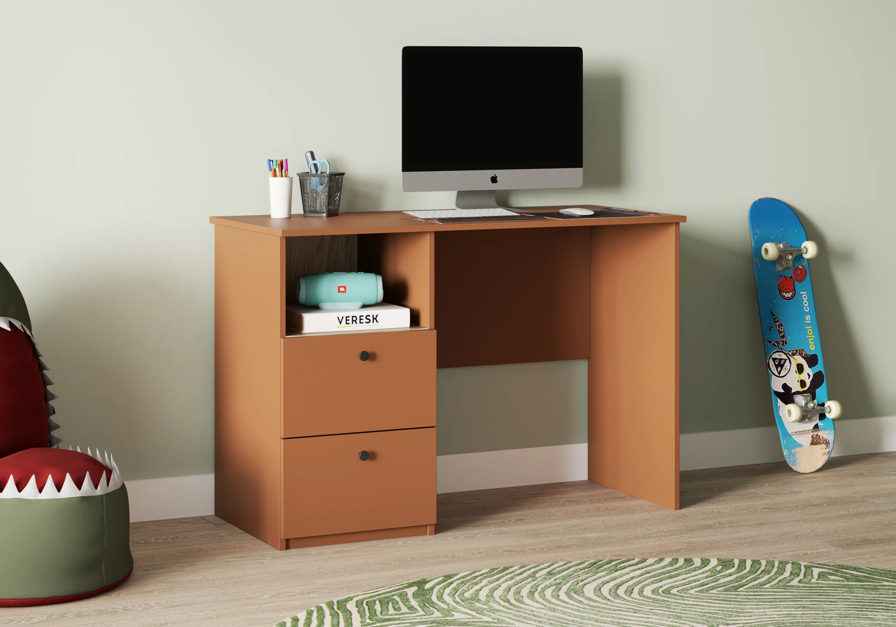 Столешница письменного стола позволит комфортно разместиться с ноутбуком, учебниками и тетрадями. Для вещей, к которым необходим быстрый доступ, предусмотрена открытая ниша и два выдвижных ящика