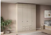 Треугольные металлические ручки представлены в трех вариантах: черный, хром и белый. Особенностью коллекции являются вкладные фасады. Антресольные дверцы открываются легким нажатием за счет системы push-to-open. Закрытый цоколь облегчает процесс уборки и делает мебель более устойчивой.
