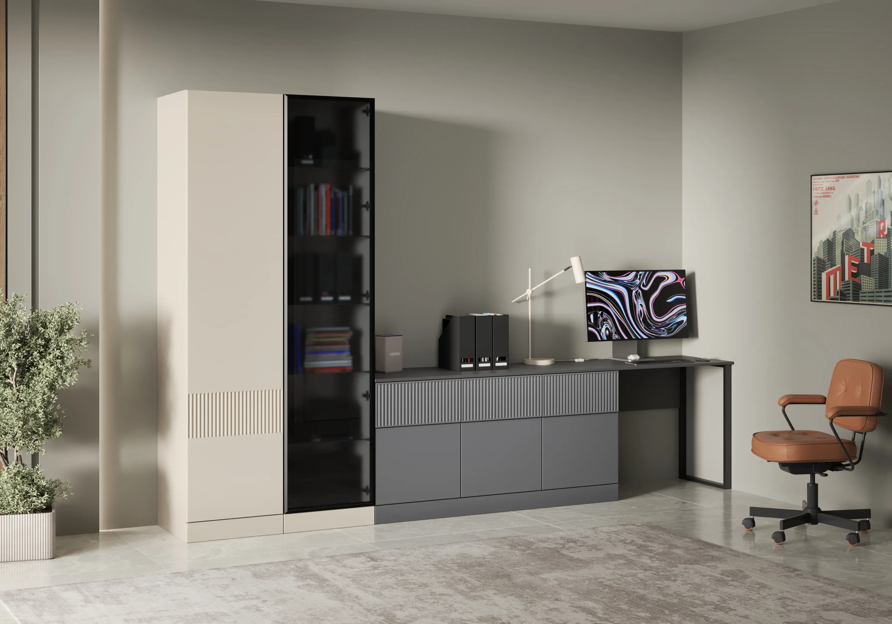 В распашном отделении второй тумбы располагаются две сетчатые полки, которые можно установить как параллельно полу, так и под наклоном. Выше находится выдвижной ящик со встроенными шариковыми направляющими.