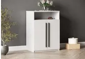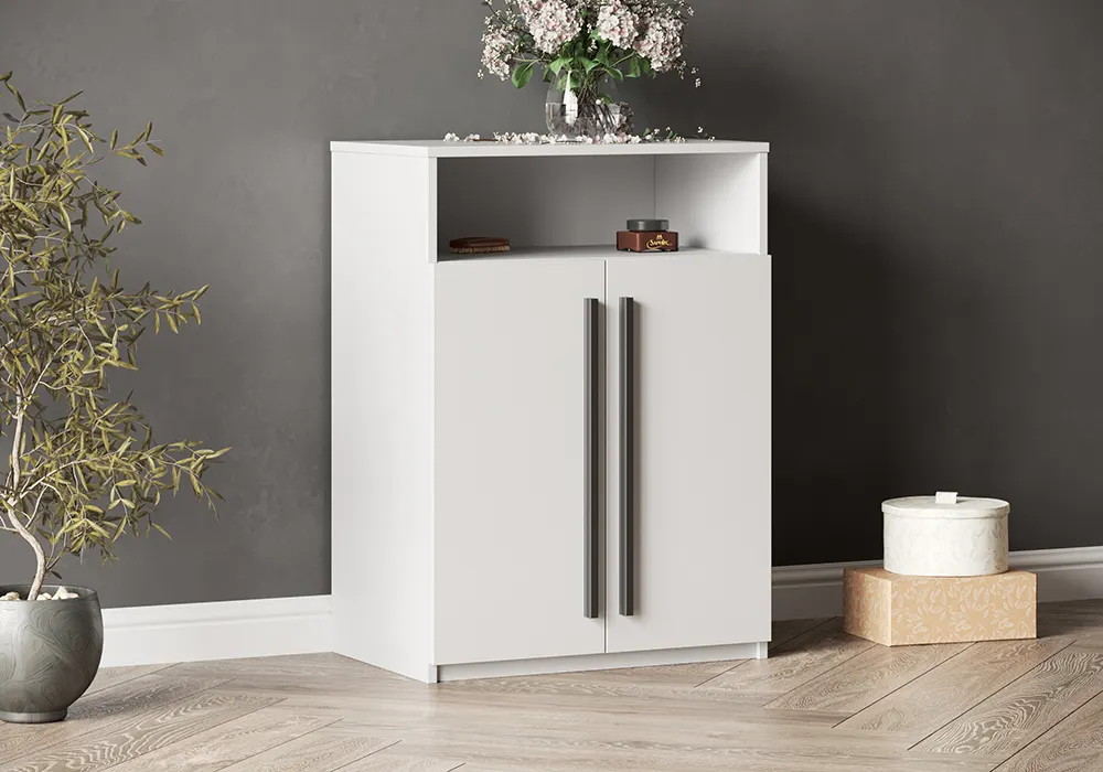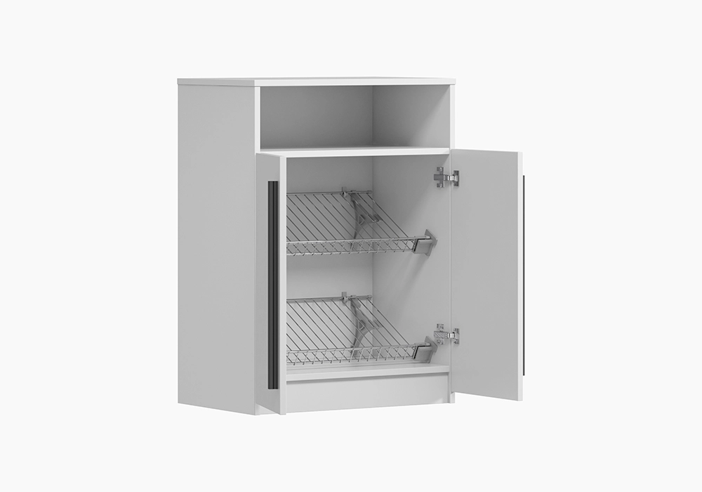 В распашной обувнице установлены две наклонные сетчатые полки. В дополнении есть открытая узкая ниша для мелочей.