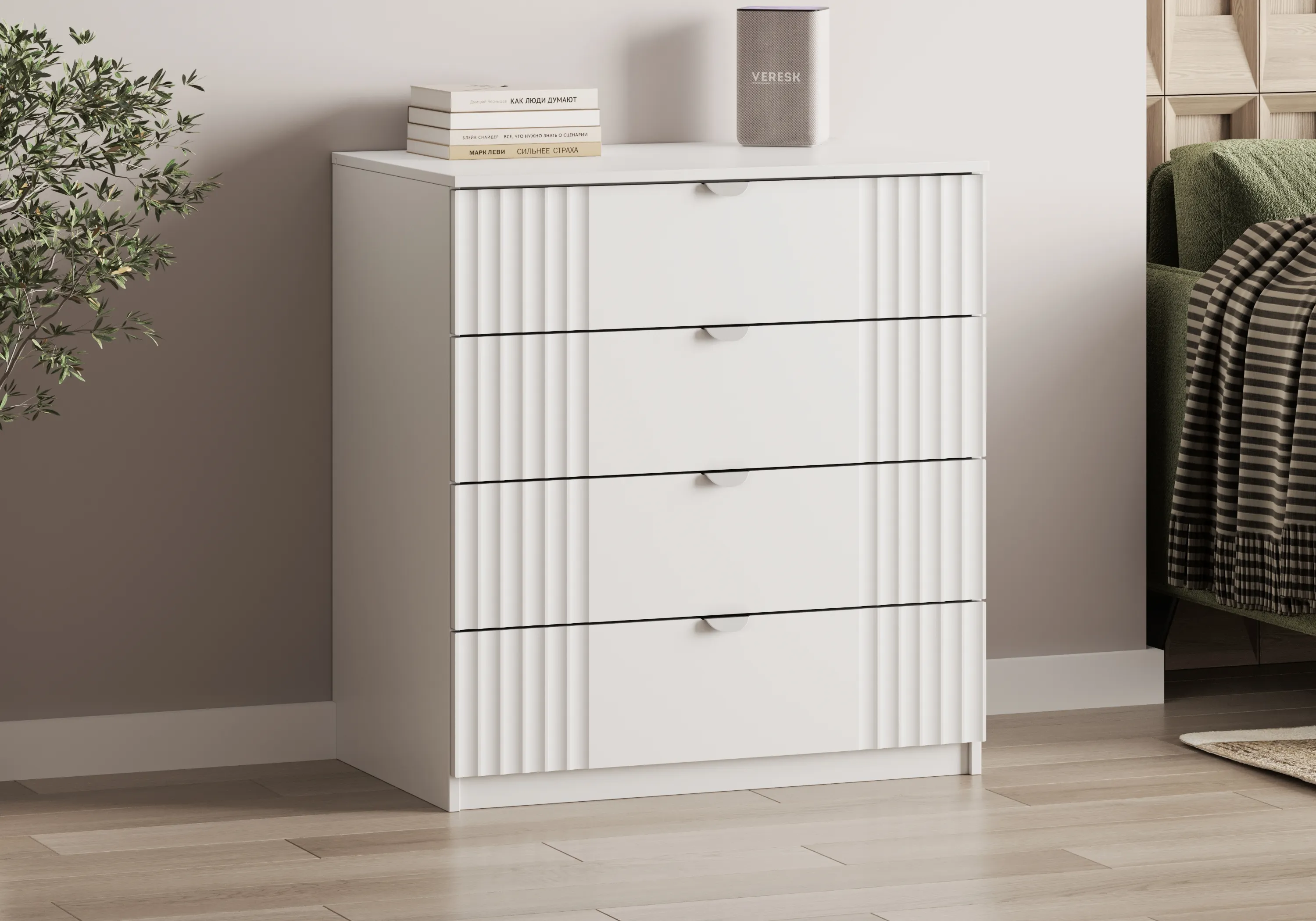Легкое рифление лицевых фасадов комода, изголовья и изножья кровати придают живой объем спокойному минималистичному интерьеру.