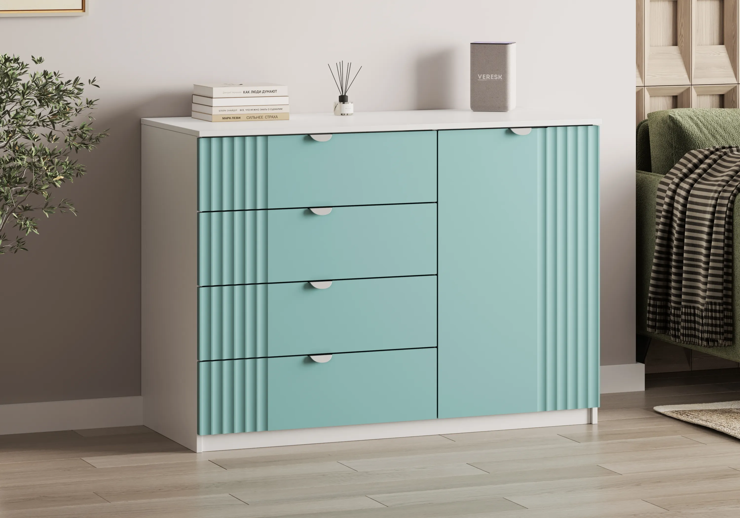 Истинные ценители порядка оценят вместительный комод, который легко организует в себе одежду, косметику, мелкую технику и прочие полезные предметы. За счет шариковых направляющих ящики тумб и комода плавно открываются, не создавая лишнего шума.