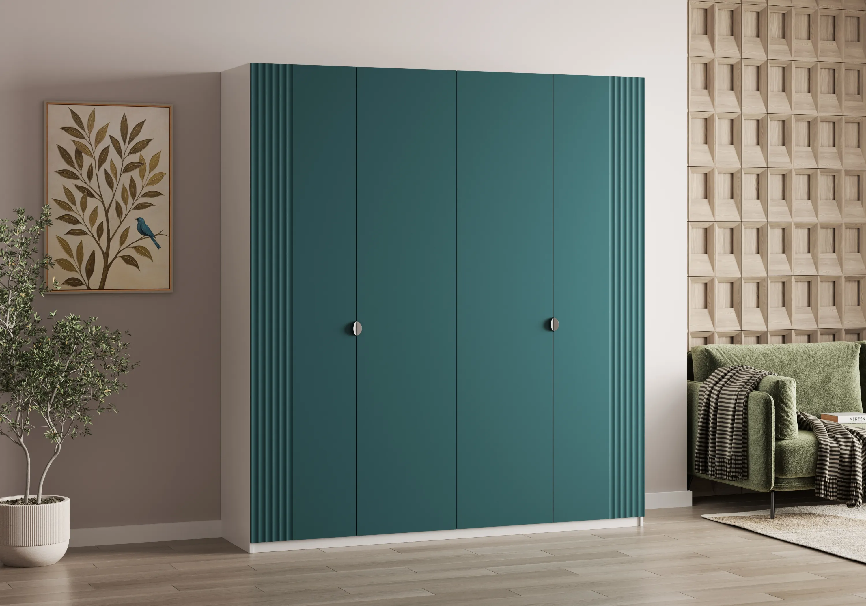 Распашной шкаф Санторини-4 комплектуется антресольной полкой, двумя бельевыми отделениями и двумя штангами (схема 4.5 ШР: Б+П+П+Б).