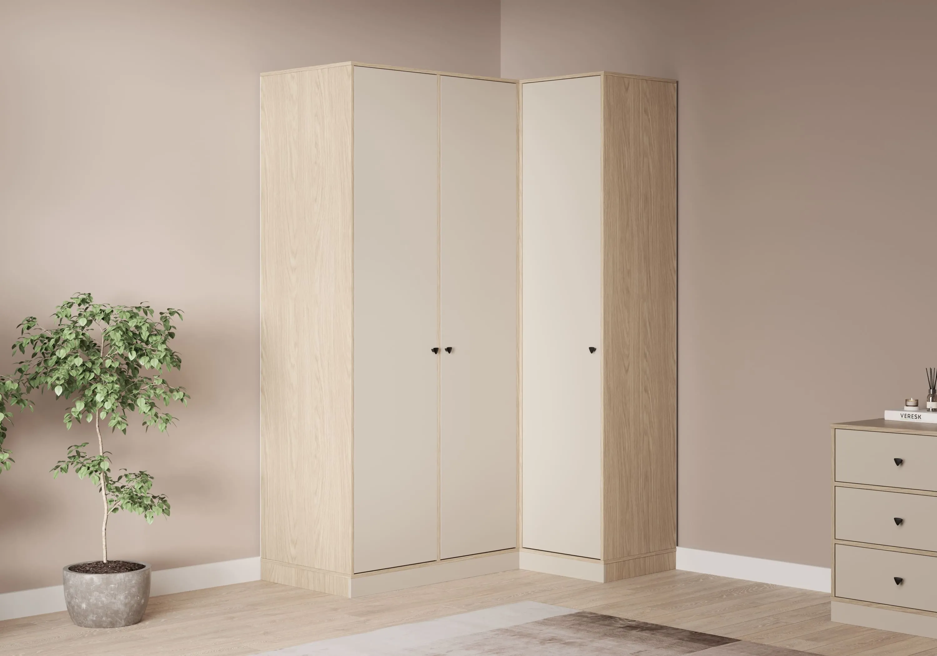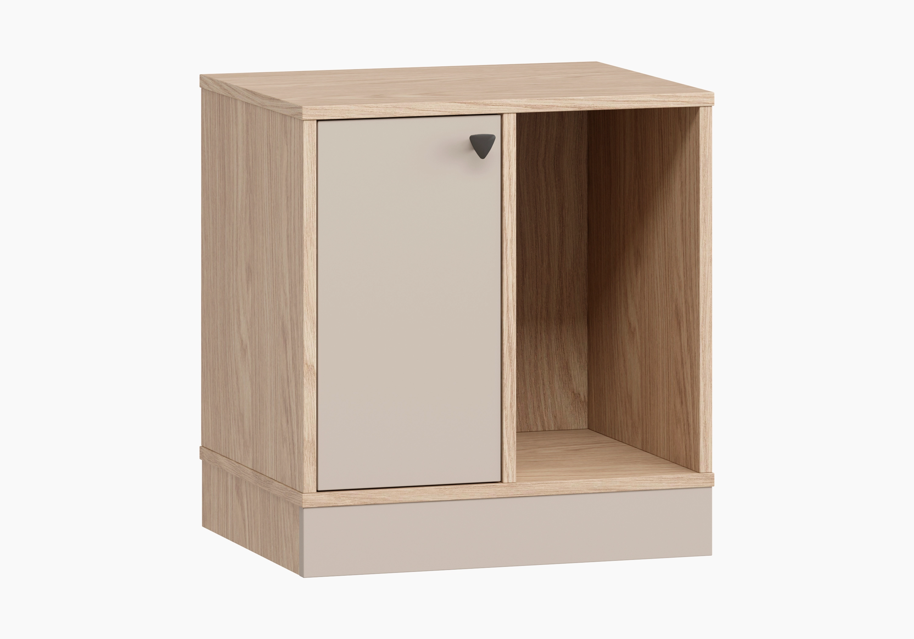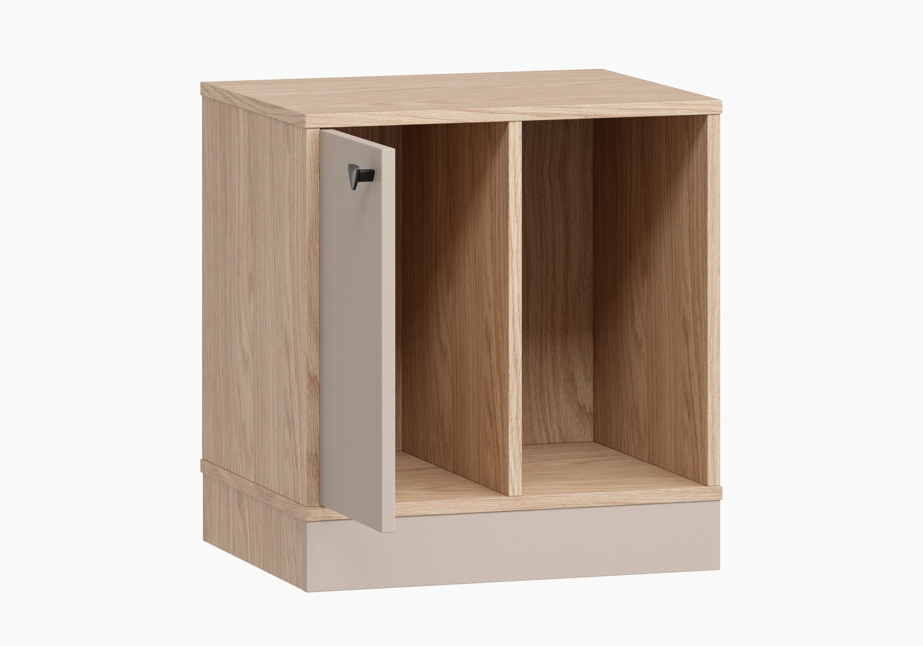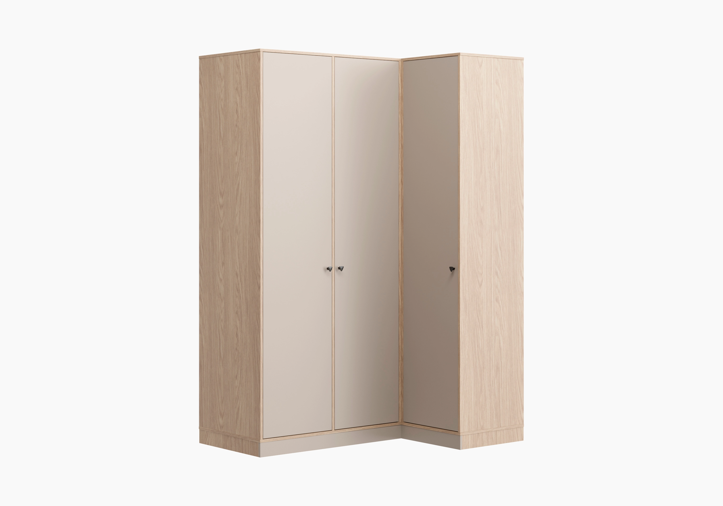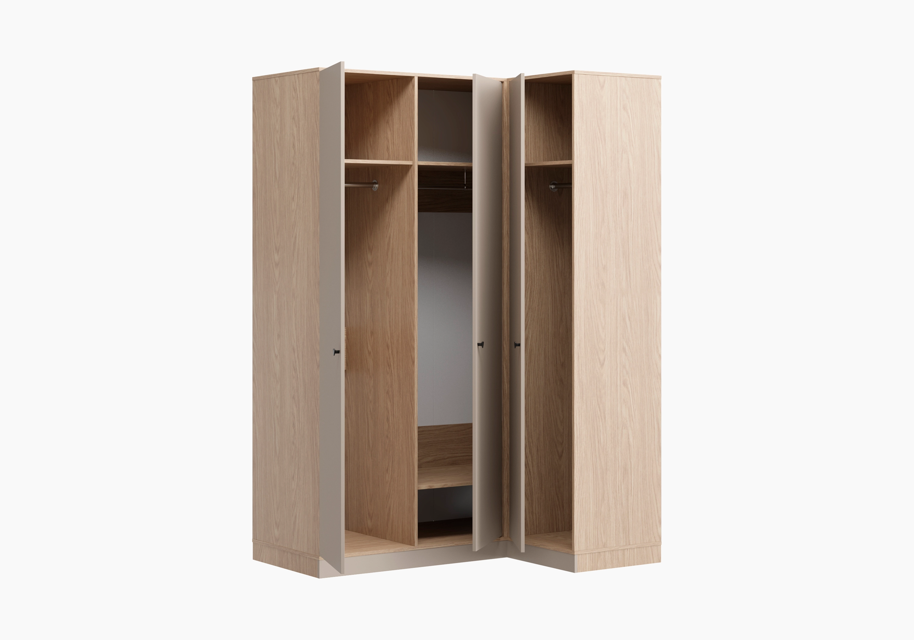 Треугольные металлические ручки представлены в трех вариантах: черный, хром и белый. Особенностью коллекции являются вкладные фасады. Закрытый цоколь облегчает процесс уборки и делает мебель более устойчивой.