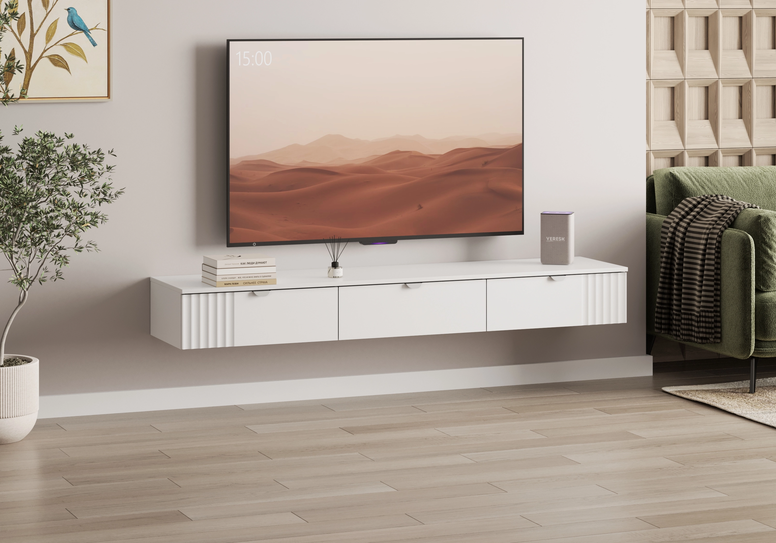 Благодаря такой износостойкой конструкции, будет возможным практично хранить внутри тумбы различные зарядные устройства, документы, пульты, книги и детские игрушки. Все три выдвижных ящика достаточно вместительны, а встроенные направляющие обеспечивают плавное бесшумное открывание. Верхняя панель предназначена для установки телевизора и небольших интерьерных украшений.