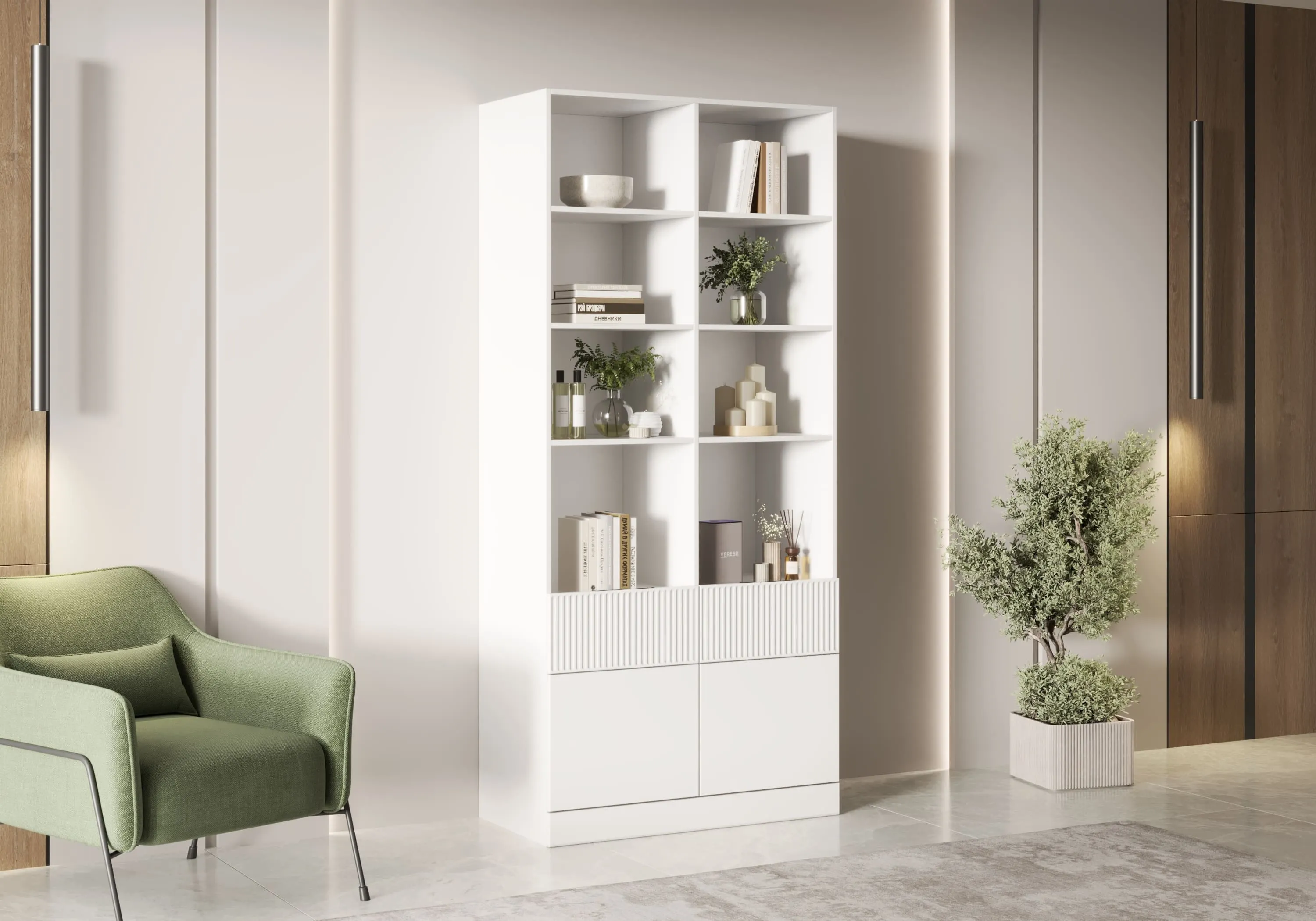 • Верхний фасад стеллажа открывается за торцевую врезную ручку, нижний от нажатия.