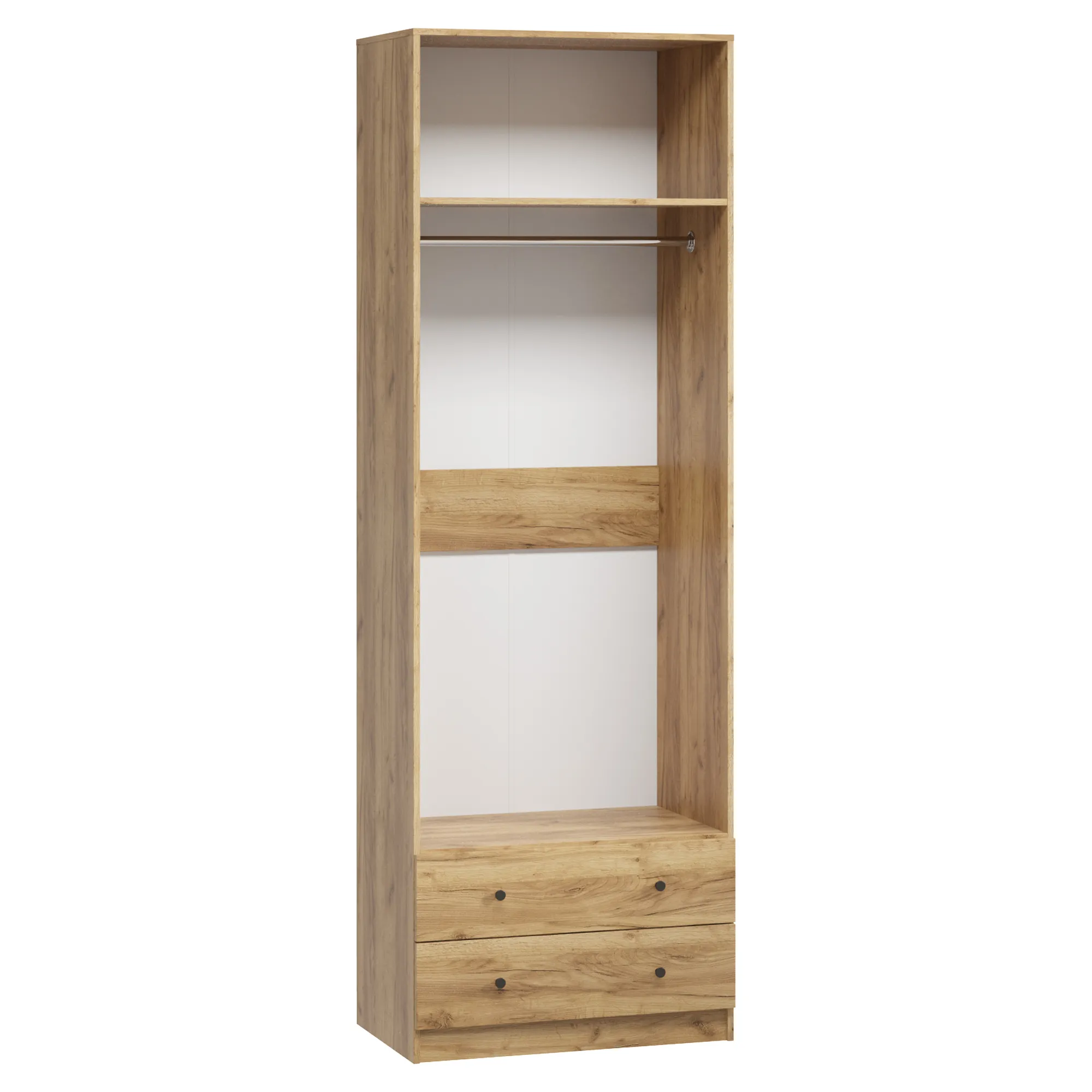 Безопасность двухдверному шкафу придает не только используемый материал, но и отсутствие ручек. Система открывания дверей push-to-open очень популярна среди тех, у кого дома есть маленькие дети. Во внутренней части стенок выполнена перфорация с шагом 128 мм по всей высоте изделия для регулировки высоты полок.