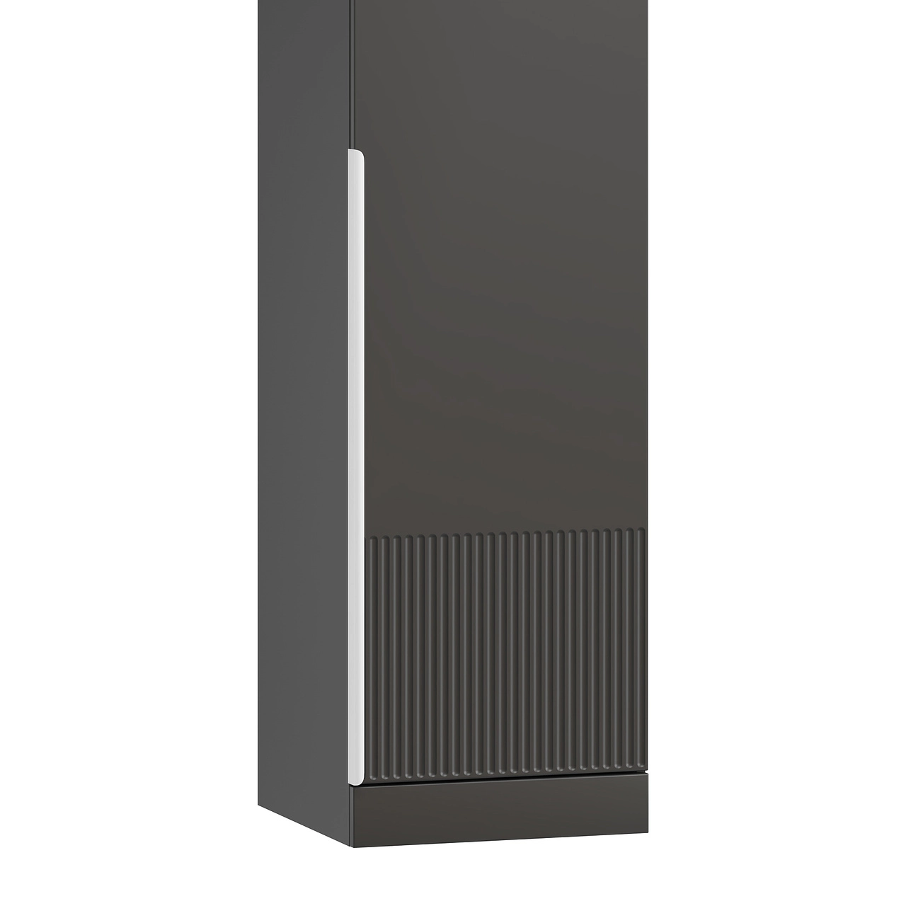 Ручки-скобы длиной 160 мм комфортны в использовании. Лицевая фурнитура изготовлена из металла с тактильно приятным покрытием. Вертикальная рифленая фрезеровка добавляет динамики сдержанным гладким фасадам. Распашные двери выполнены из МДФ высокой прочности в пленке ПВХ.