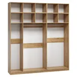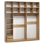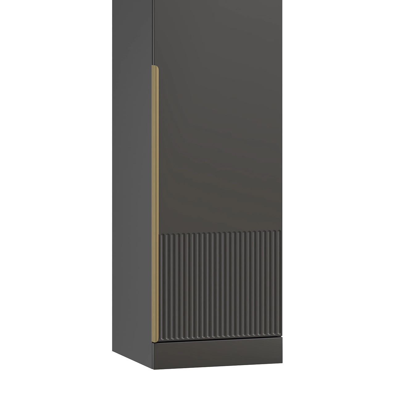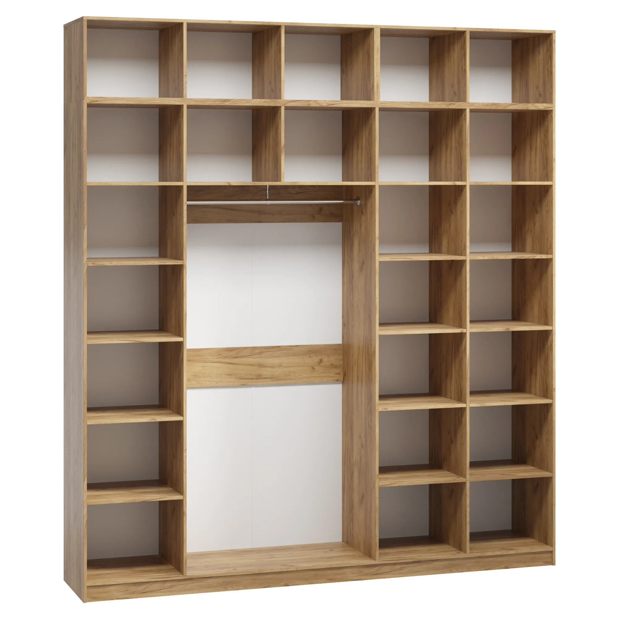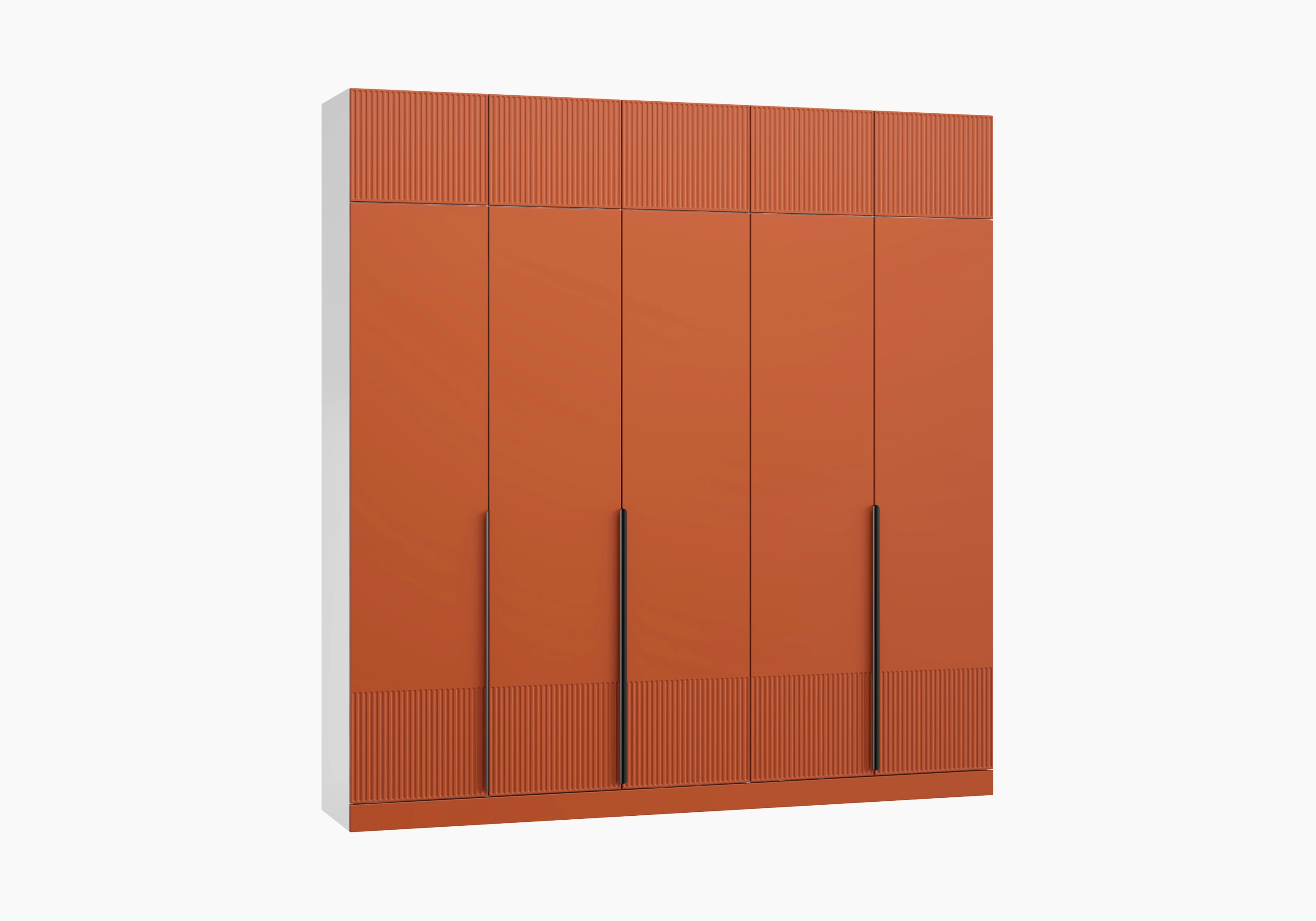В базовой комплектации — пять платяных отделений с металлическими штангами, пять компактных секции для хранения и пять распашных антресолей на системе push-to-open. Дополнительно можно установить выдвижные ящики, полки, кронштейны, штанги, пантографы и зеркала.