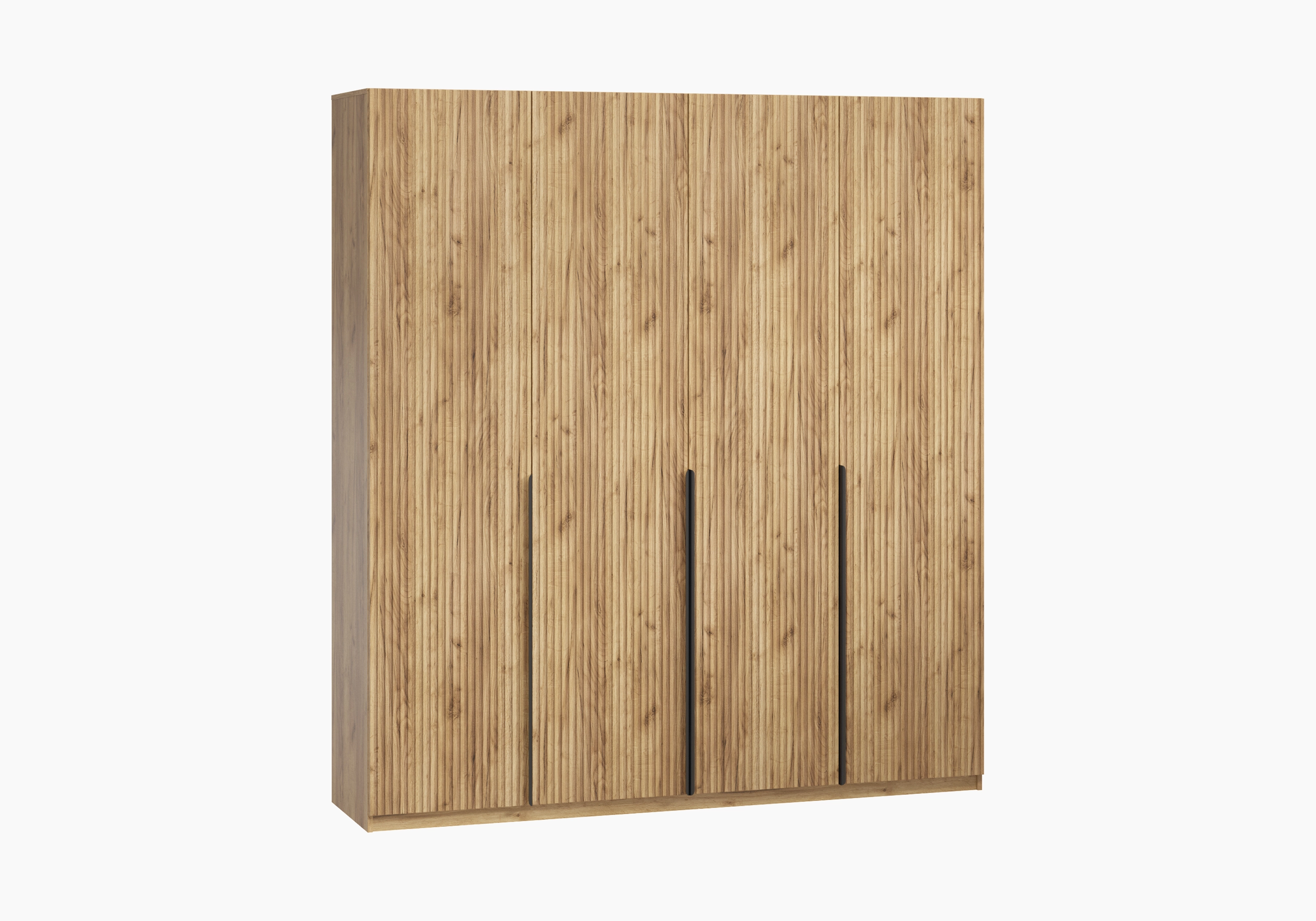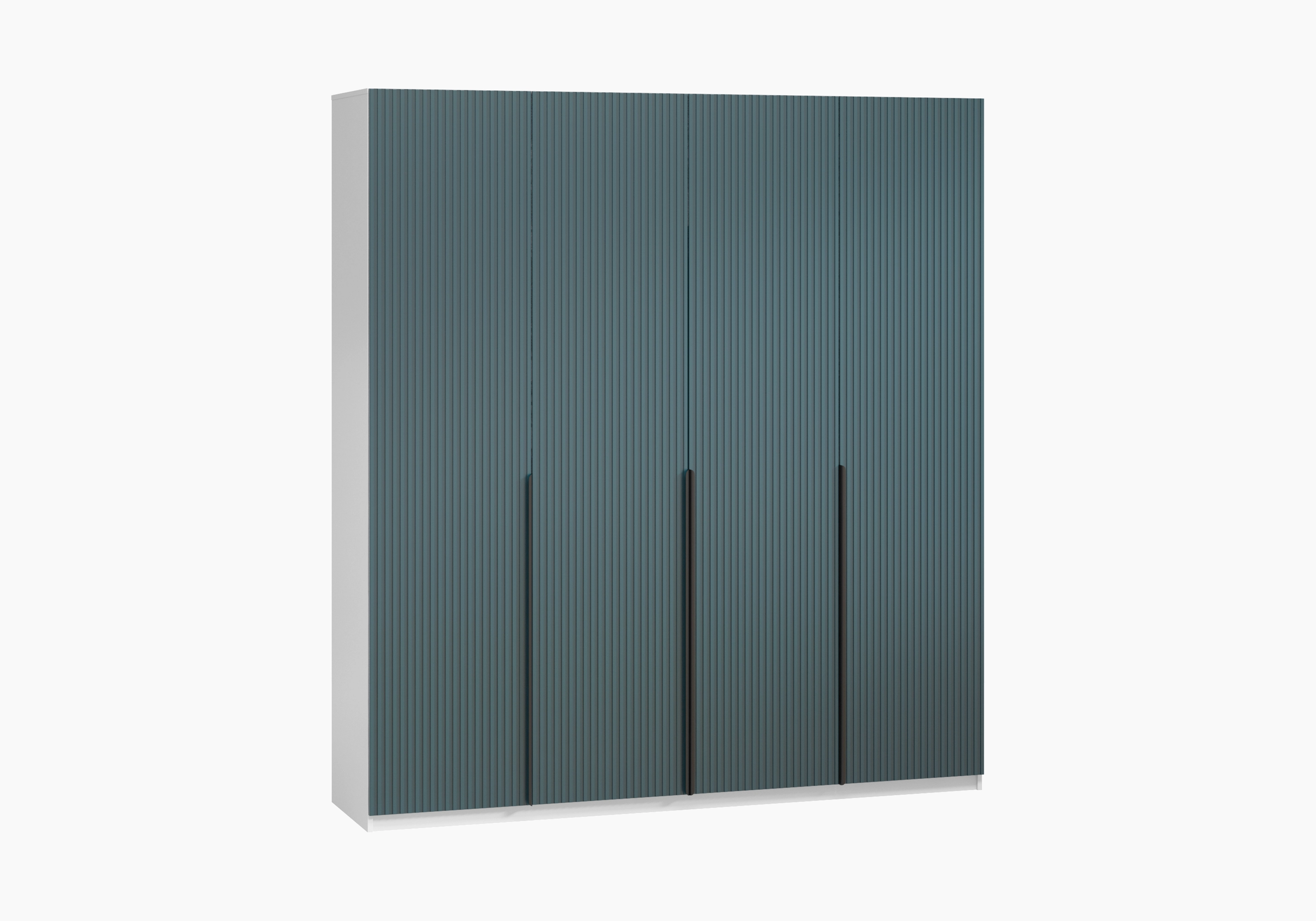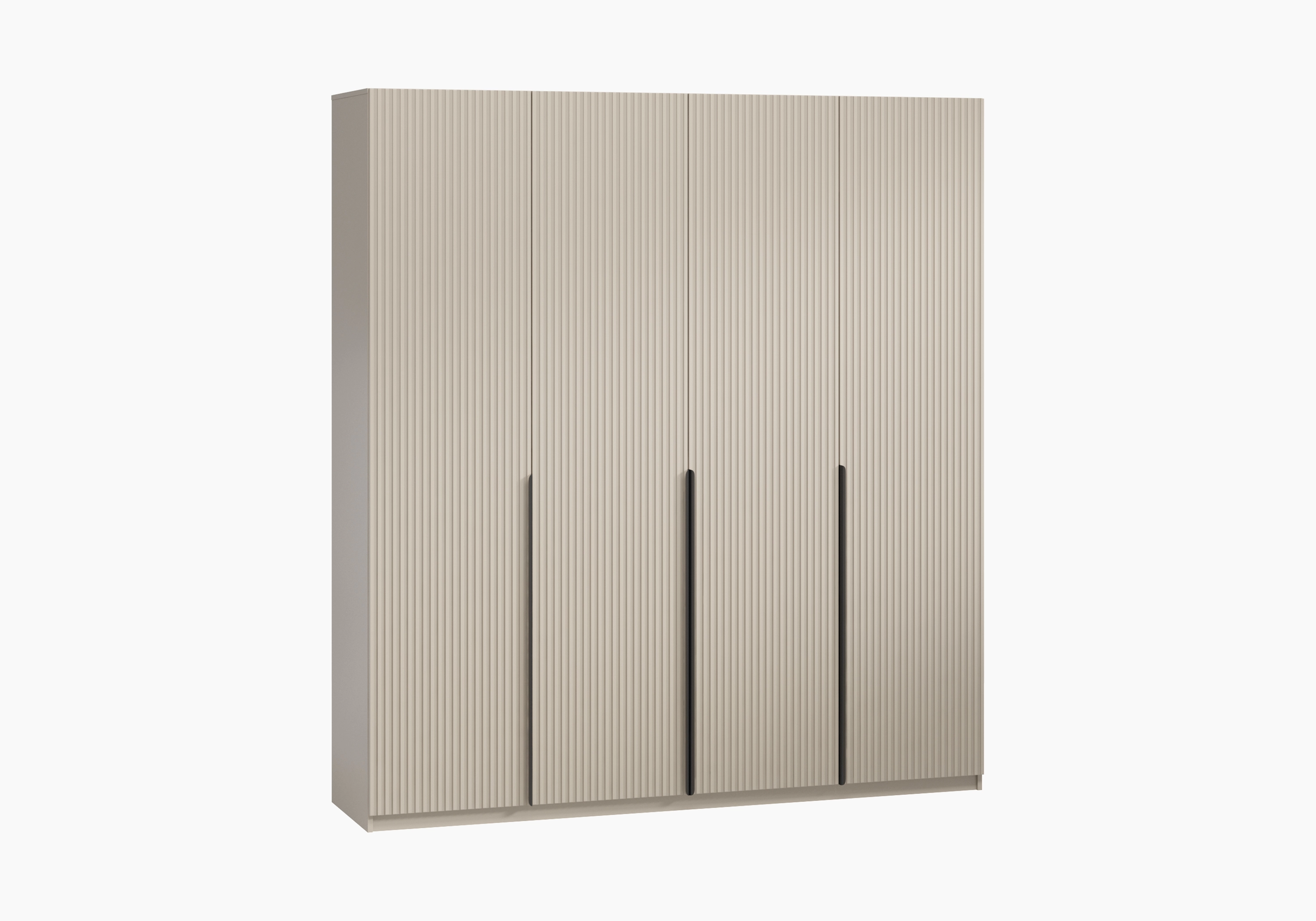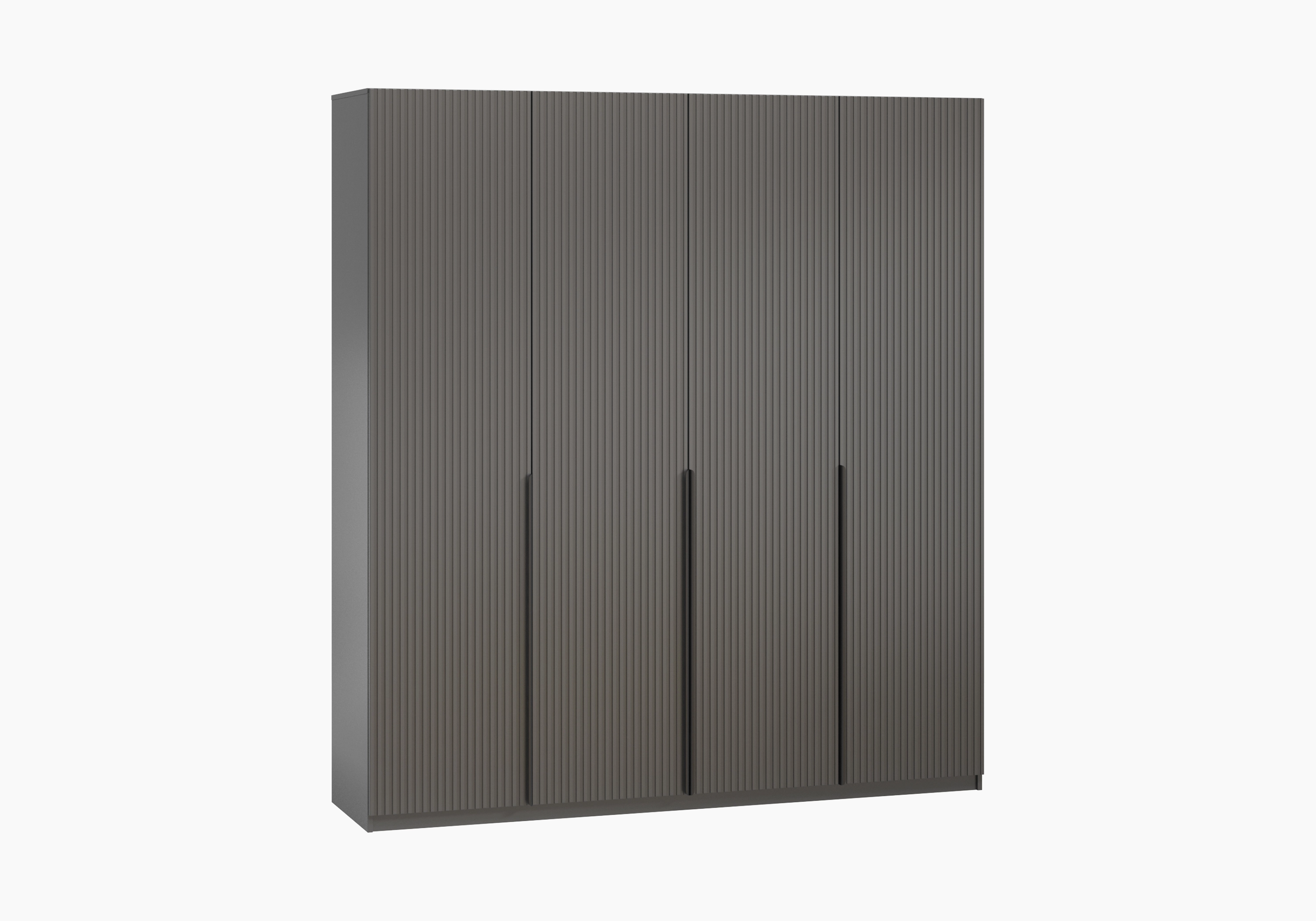 Рифленая фрезеровка визуально вытягивает четырехдверный шкаф в высоту, оживляя современный минималистичный интерьер. Дизайн завершают стильные металлические торцевые ручки.