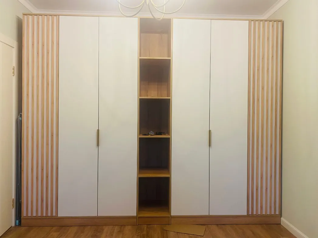 На полках удобно разложить кофты, брюки, мелкие органайзеры для нижнего белья, обувь и постельные принадлежности. На встроенную штангу можно разместить вешалки с куртками, костюмами и платьями. Есть возможность добавить блоки с ящиками и выдвижной кронштейн. Скрытый цоколь меньше давит на покрытие пола и делает шкаф более устойчивым.