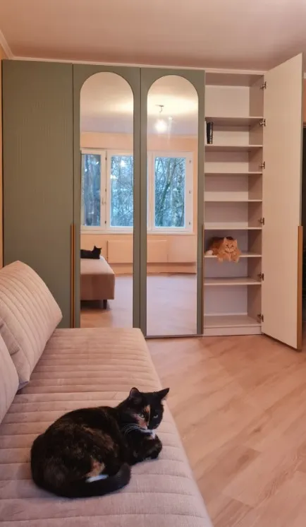 Зеркала на двух фасадах визуально расширяют пространство, наполняют комнату светом и добавляют удобства в повседневное использование