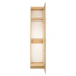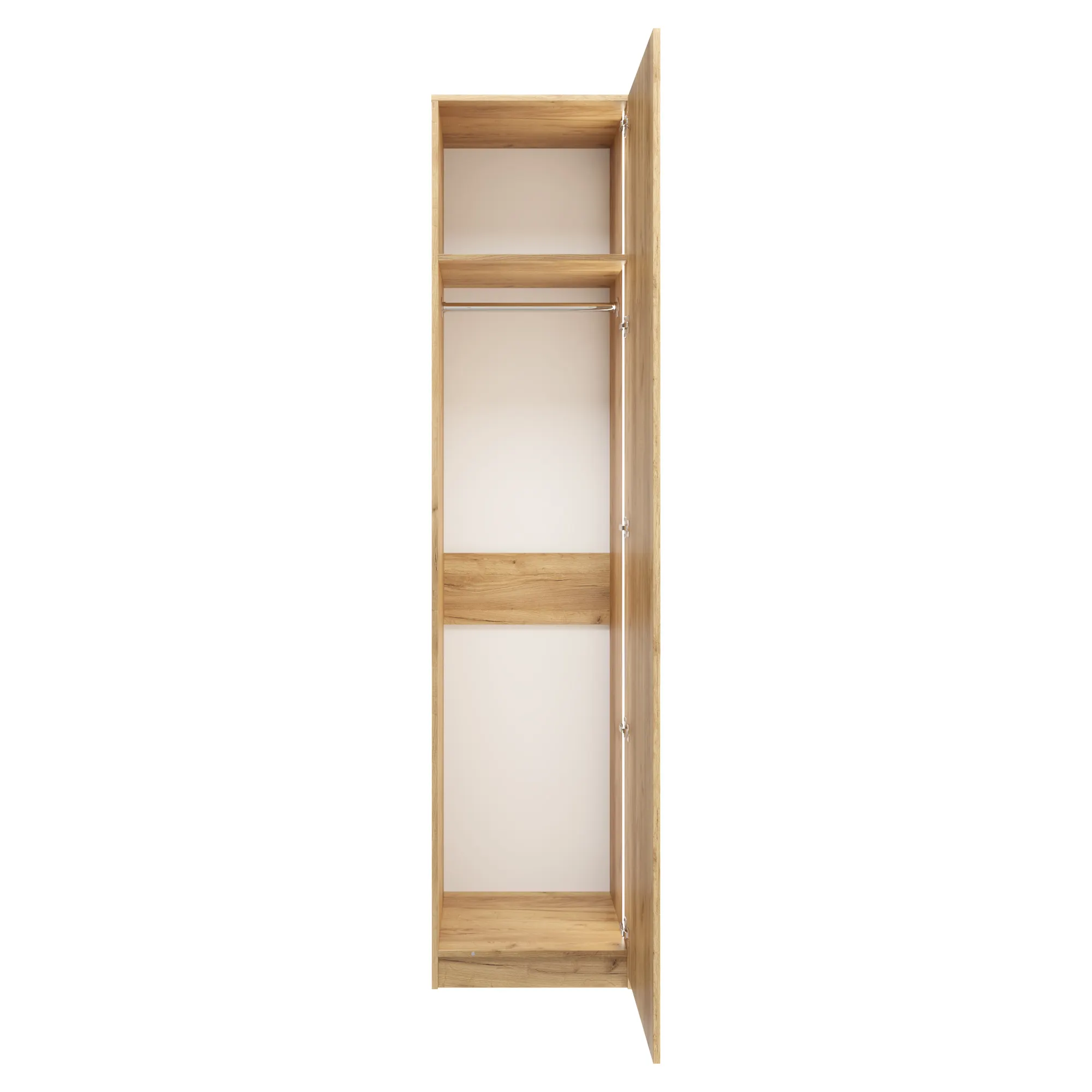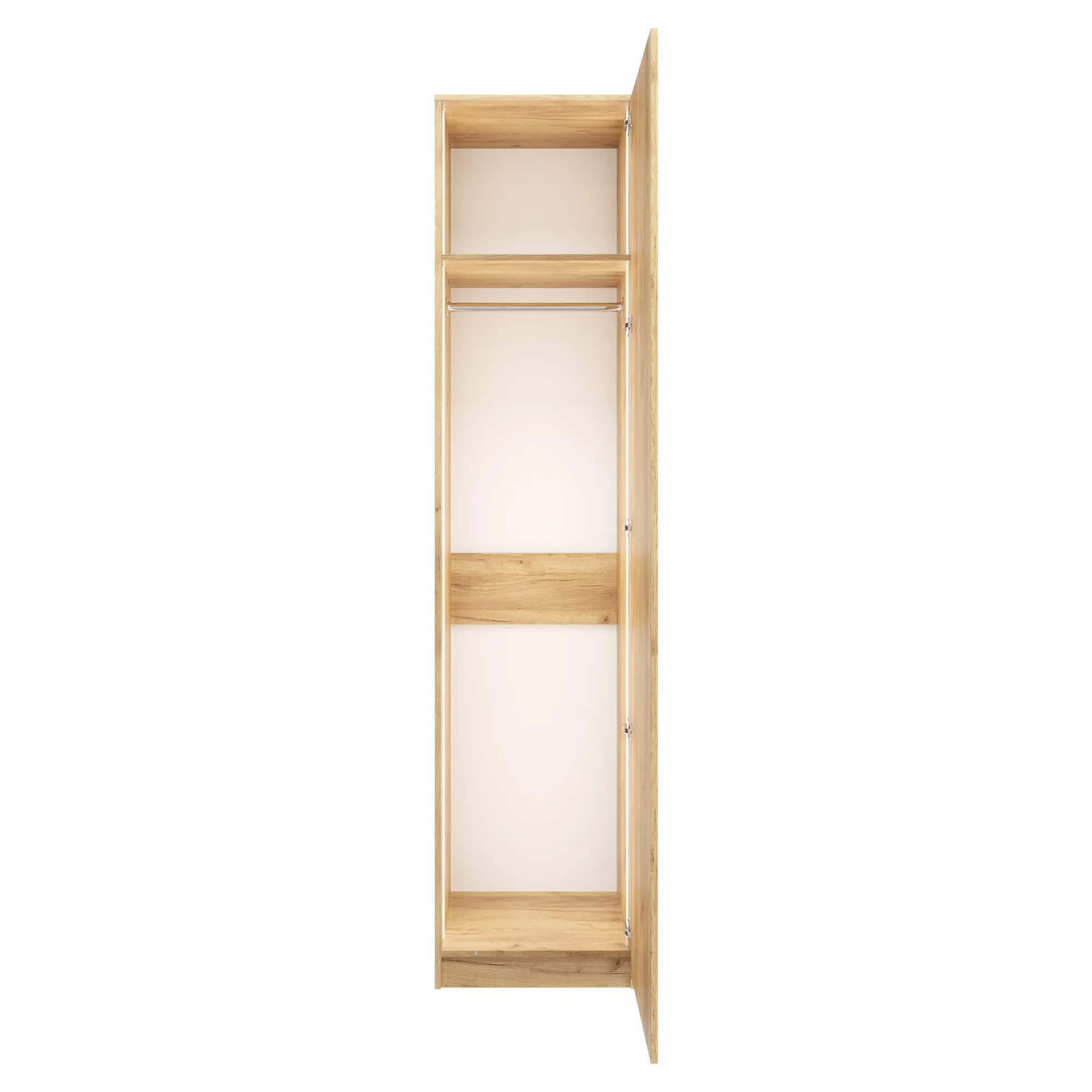 Оригинальная ручка из массива дерева смотрится стильно и придает однотонным поверхностям объем. Фасады выполнены из прочного МДФ. В базовой комплектации есть антресоль со встроенной системой push-to-open, открытая секция для сезонных вещей и мелких аксессуаров и штанга для вешалок с куртками, платьями и костюмами.