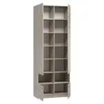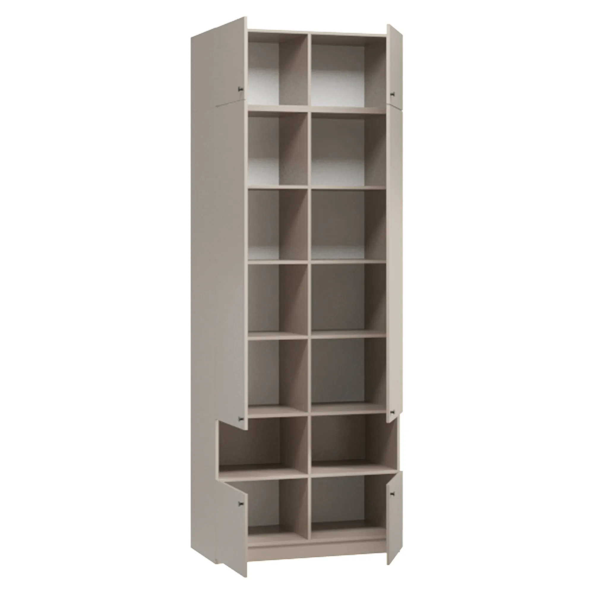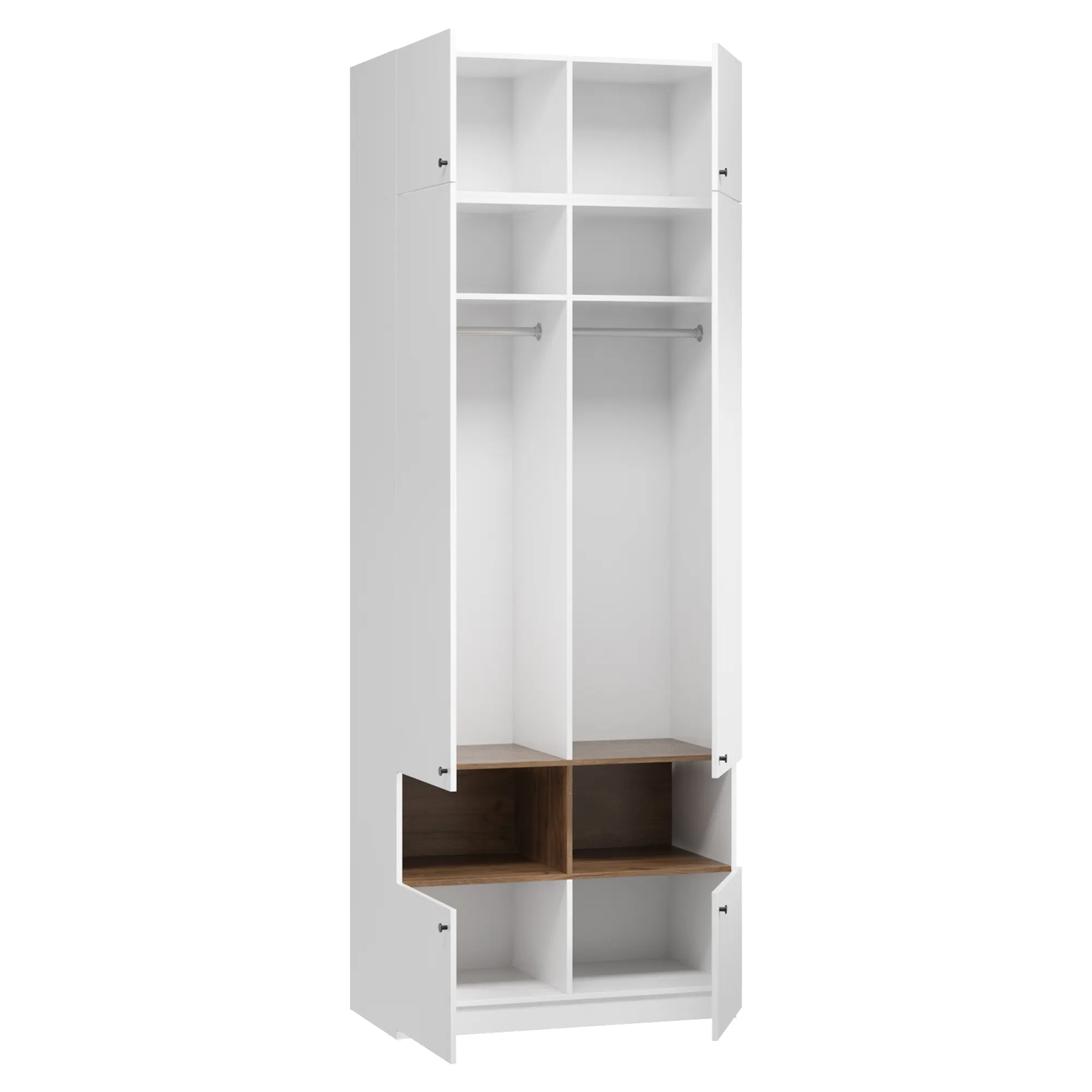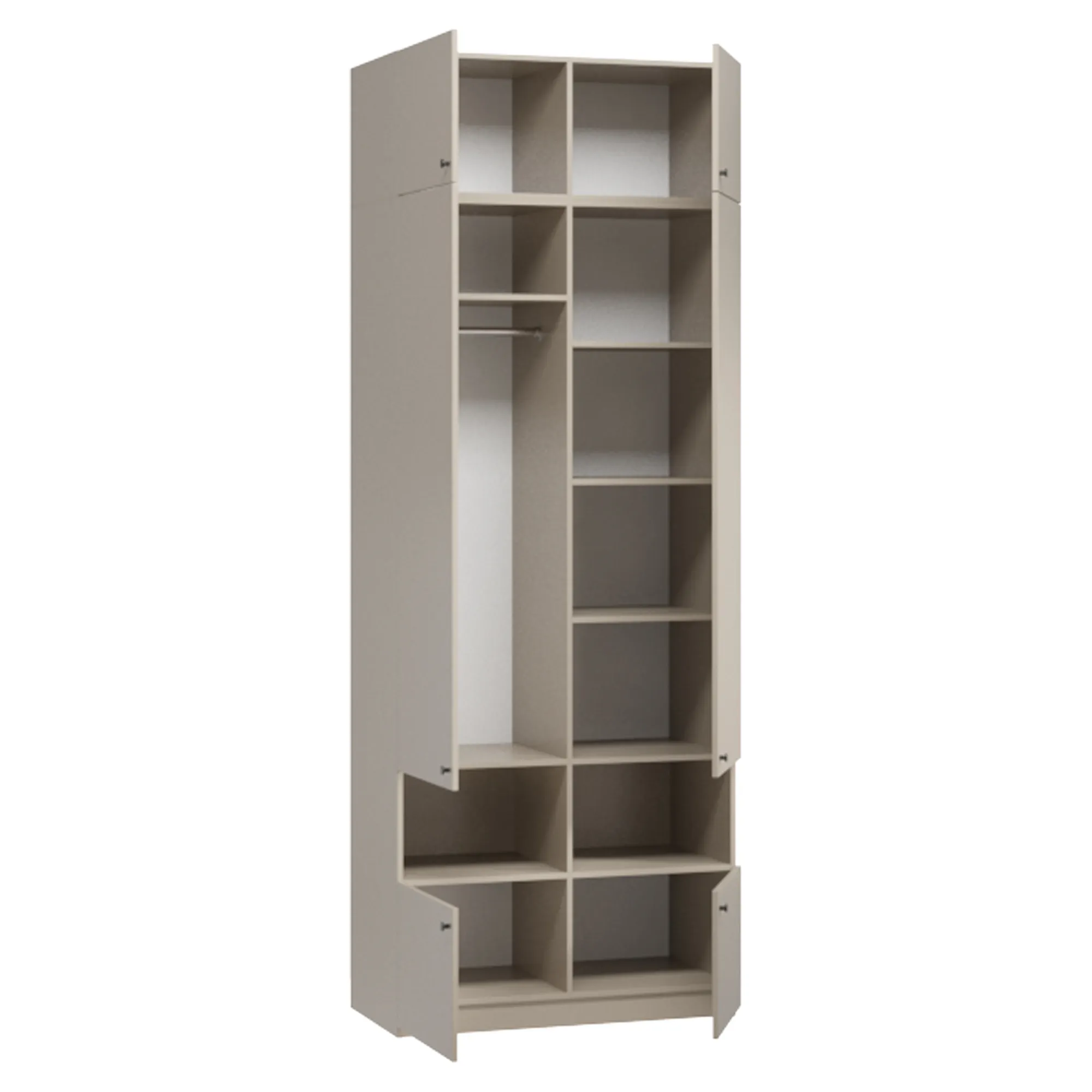Ручки-кнопки не создают излишней сложности в дизайне и удобны в использовании. Комплекты постельного белья и сезонные вещи удобно разложить в антресоли и на полках. На открытых нишах можно расставить декор и предметы первой необходимости. В платяных отделениях встроены крепкие штанги для вешалок. Нижние распашные секции вместят обувь, книги, канцелярию и мелкие бытовые приспособления. Закрытый цоколь облегчает уборку и придает устойчивости конструкции.