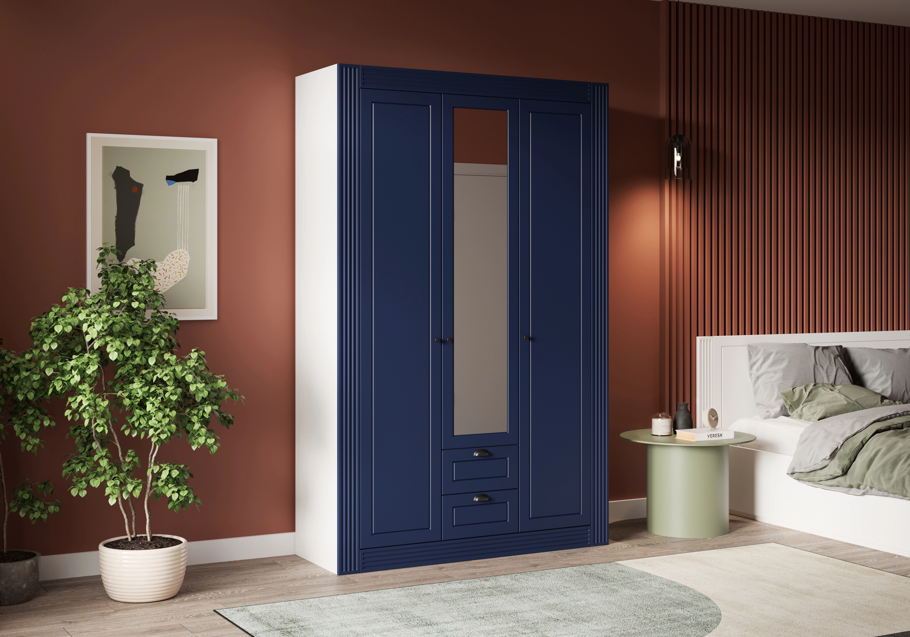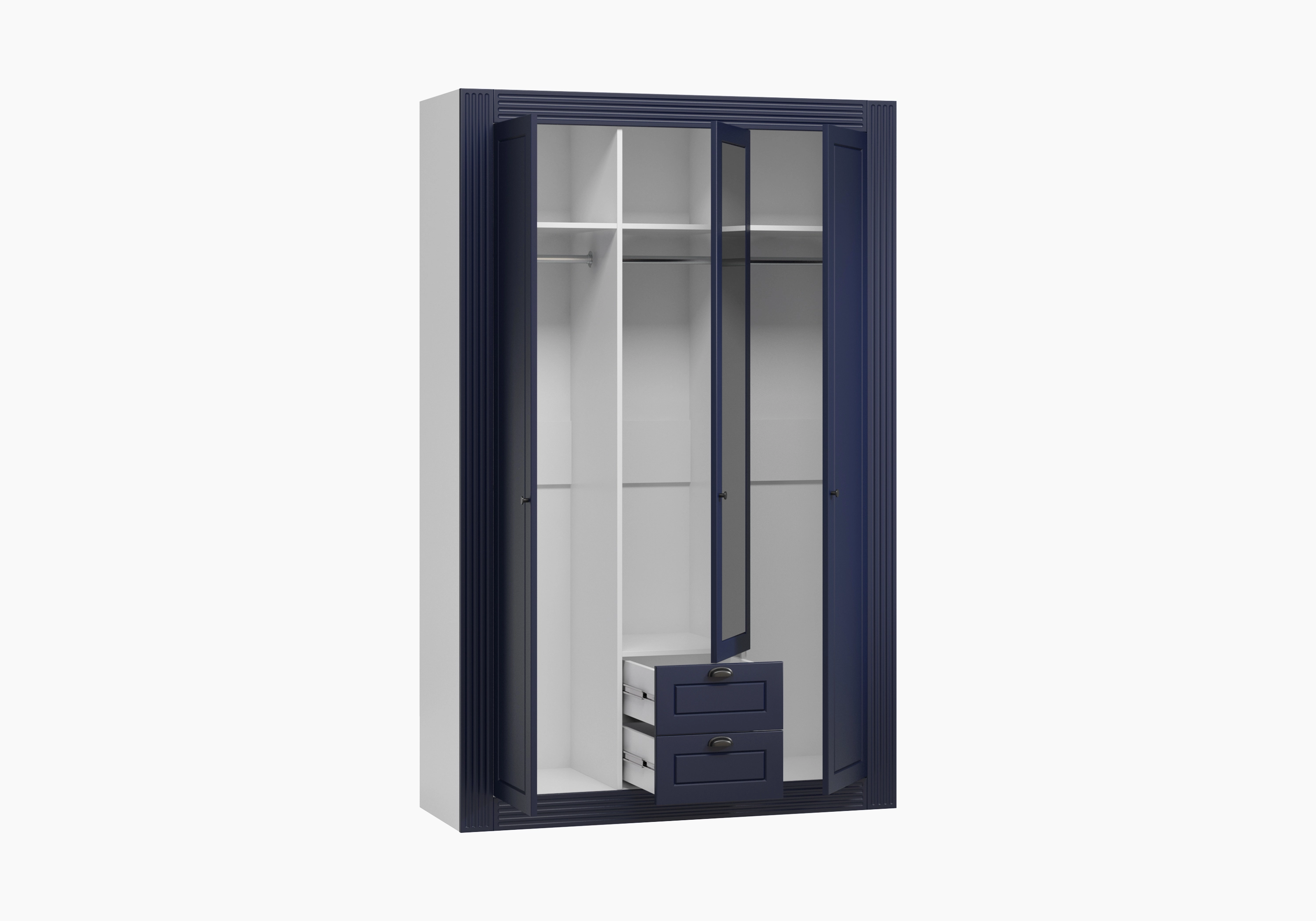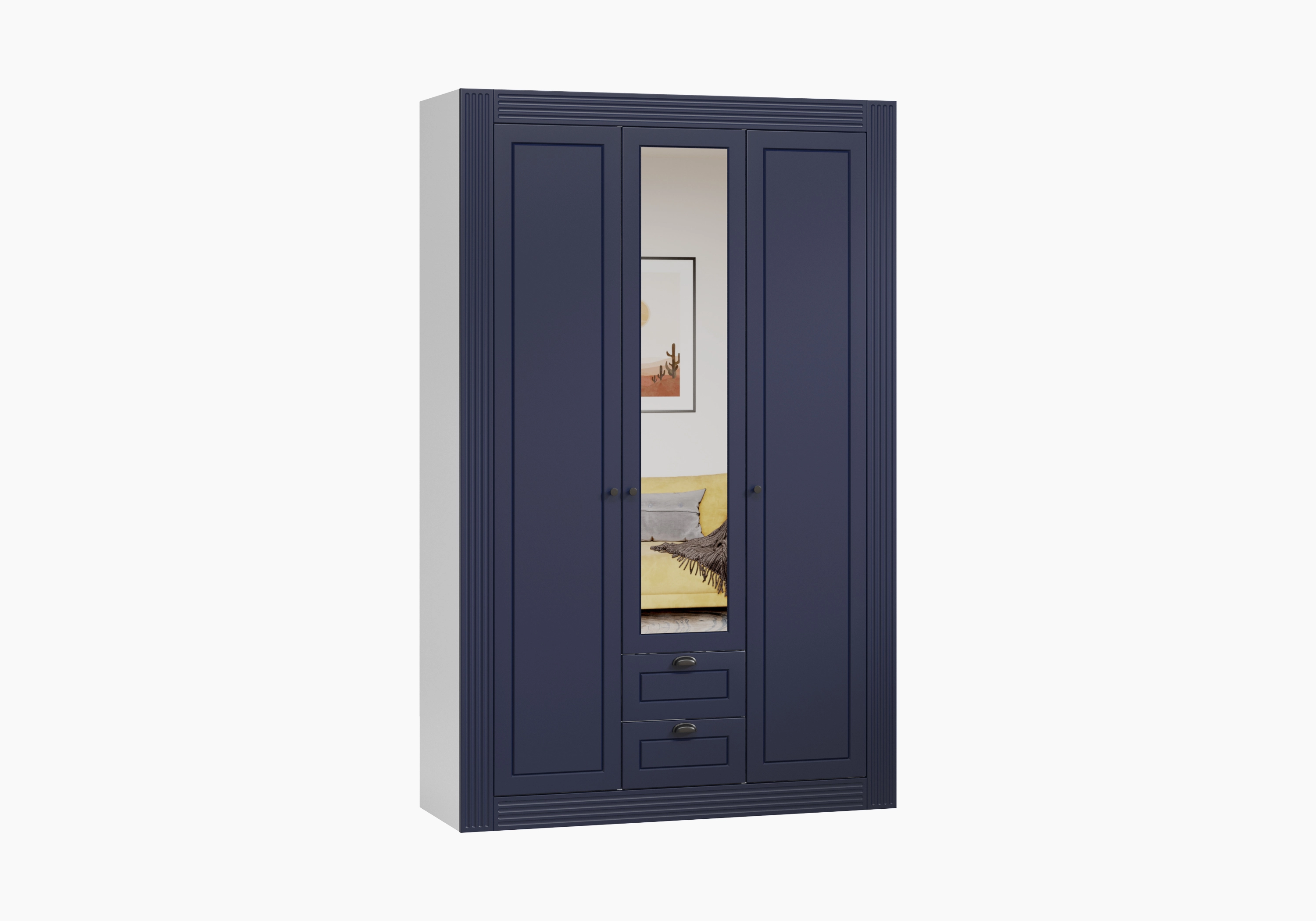 Конструкция состоит из трех платяных отделений со штангами. Также есть верхние полки для сезонных вещей, обуви, постельных принадлежностей и мелких аксессуаров. В ящики встроены шариковые направляющие, обеспечивающие плотное и бесшумное закрывание. Скрытый цоколь предотвращает скопление пыли под трехдверным шкафом и делает конструкцию более устойчивой.