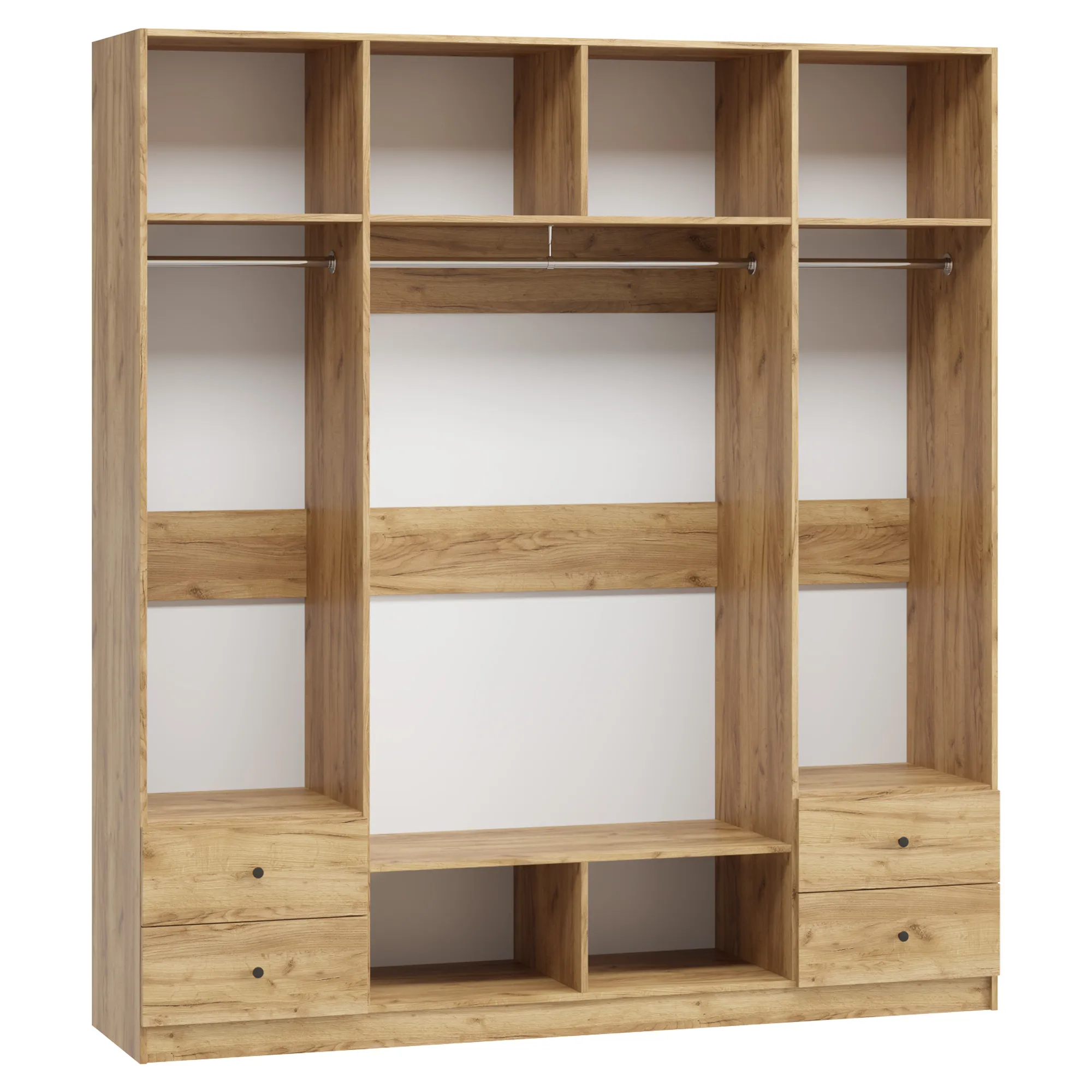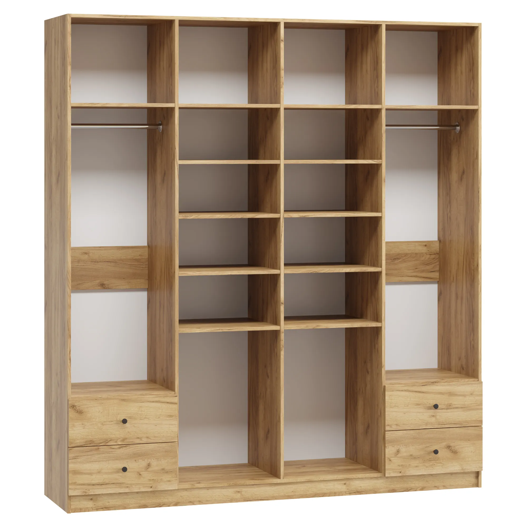 • При высоте 1800 мм в отделение Белье над ящиками устанавливается 3 полки; при высоте 1900 мм и 2000 мм - 4 полки; при высоте 2100 мм и выше - 5 полок.