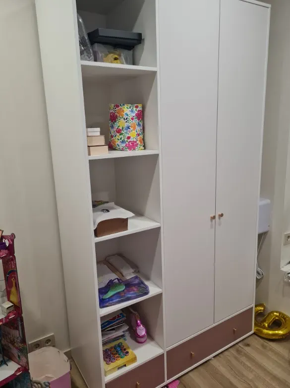 В платяном отделении установлена штанга для вешалок и верхние полки для сезонных вещей и мелких аксессуаров. Шариковые направляющие обеспечивают бесшумное и легкое закрывание трех ящиков. Встроенный стеллаж позволит собрать в одном месте книги, коллекционные предметы и другие нужные предметы.