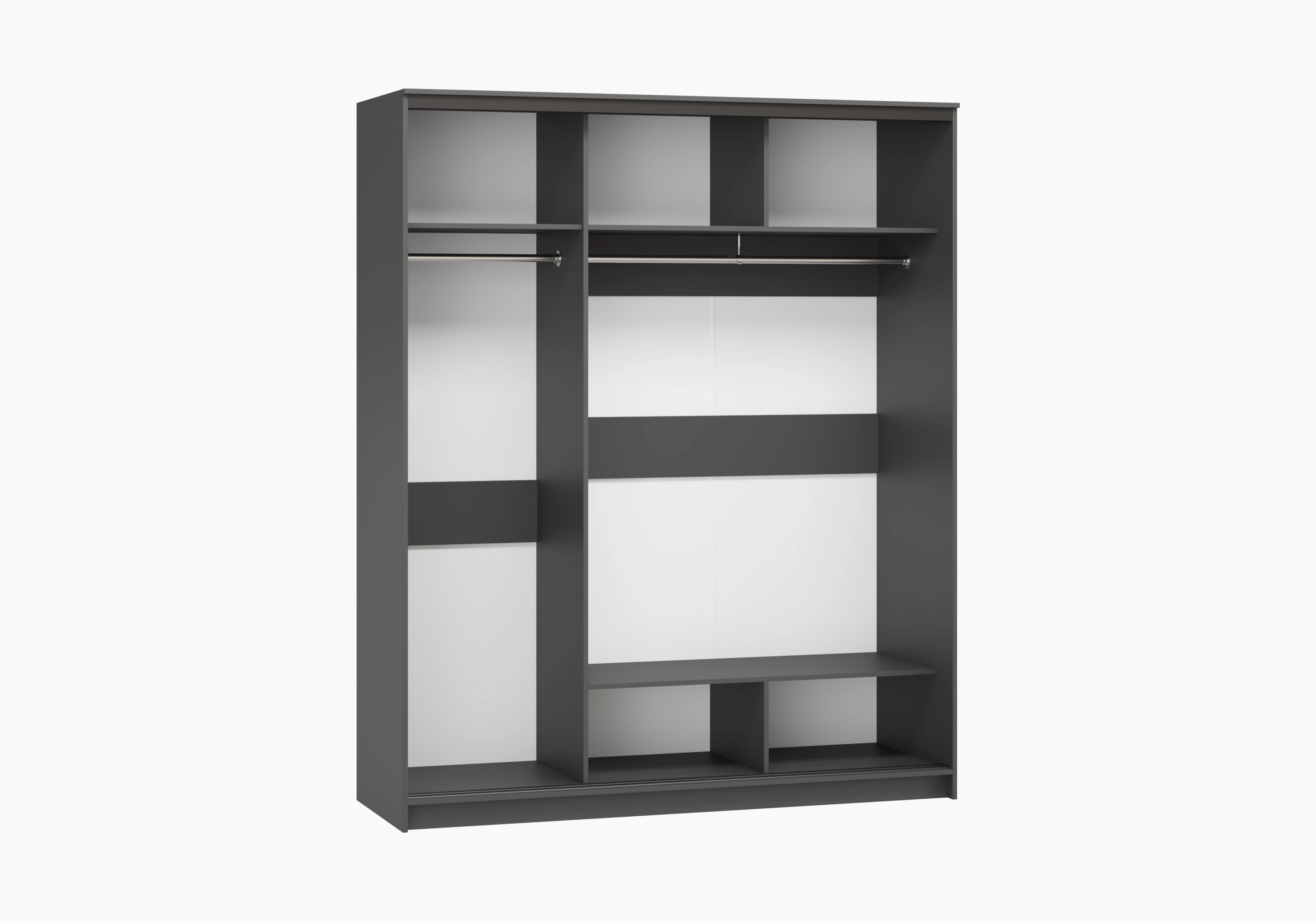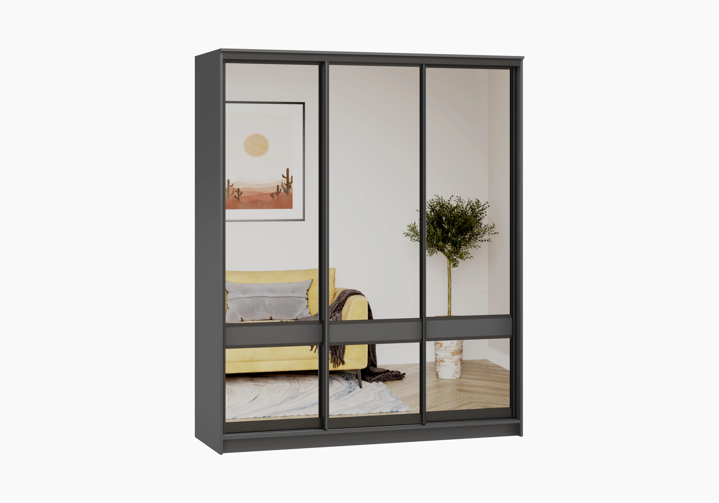 Зеркальные фасады украшают вставки из ЛДСП 10 мм, добавляющие больше привлекательности и эффектности дизайну модели. Внутри есть отверстия с шагом в 12,8 см для регулирования высоты полок. Высокий цоколь предотвращает скопление пыли и делает конструкцию более устойчивой.
