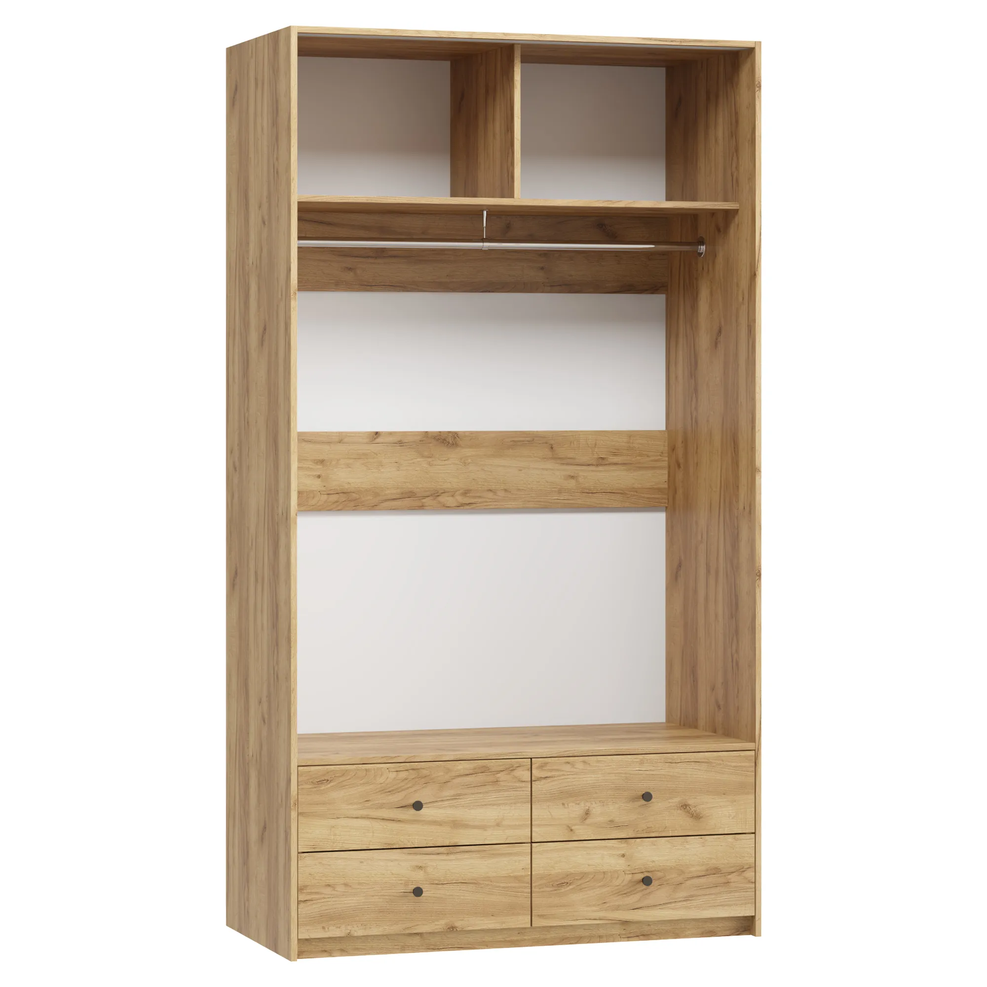 Сборный корпус двухдверного шкафа состоит из МДФ в пленке soft-touch и ЛДСП класса Е1. Надежная фурнитура обеспечивает изделие износостойкостью и практичностью.