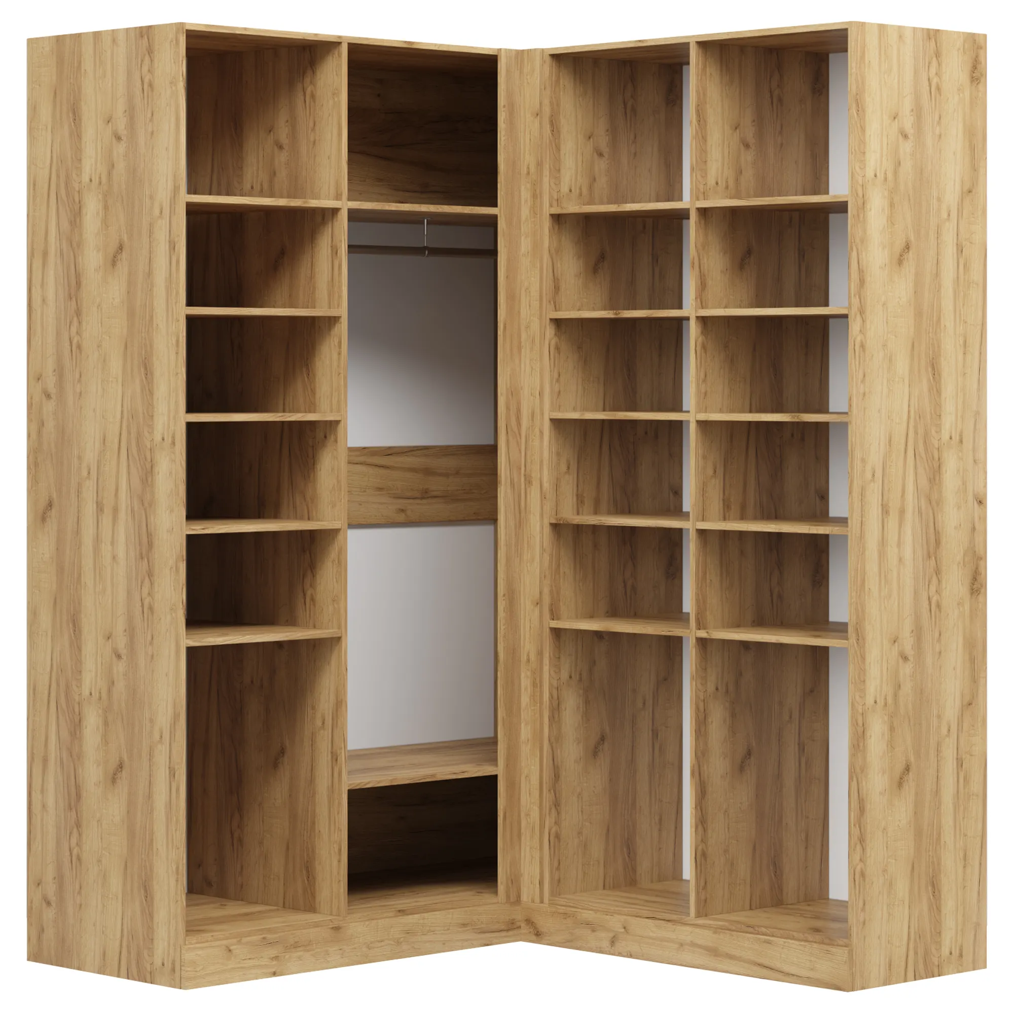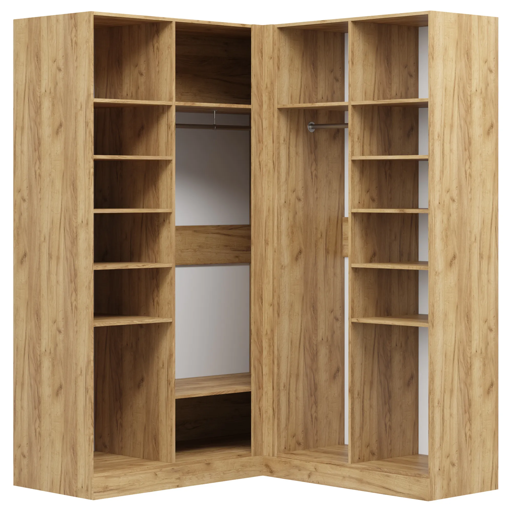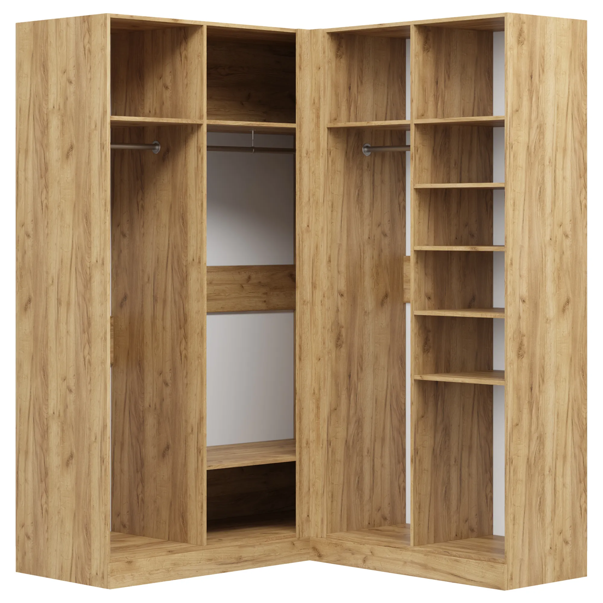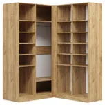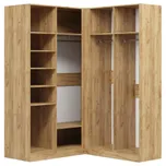 В платяных отделениях встроены штанги для платьев, пиджаков и курток. Для сумок, комплектов белья и коробок предусмотрены полки. Внутрь можно добавить светильник с датчиком движения, блоки с ящиками, сетчатые полки, выдвижной кронштейн и зеркала. Опция «выбрать вырез под плинтус» позволит придвинуть угловой шкаф плотно к стене.