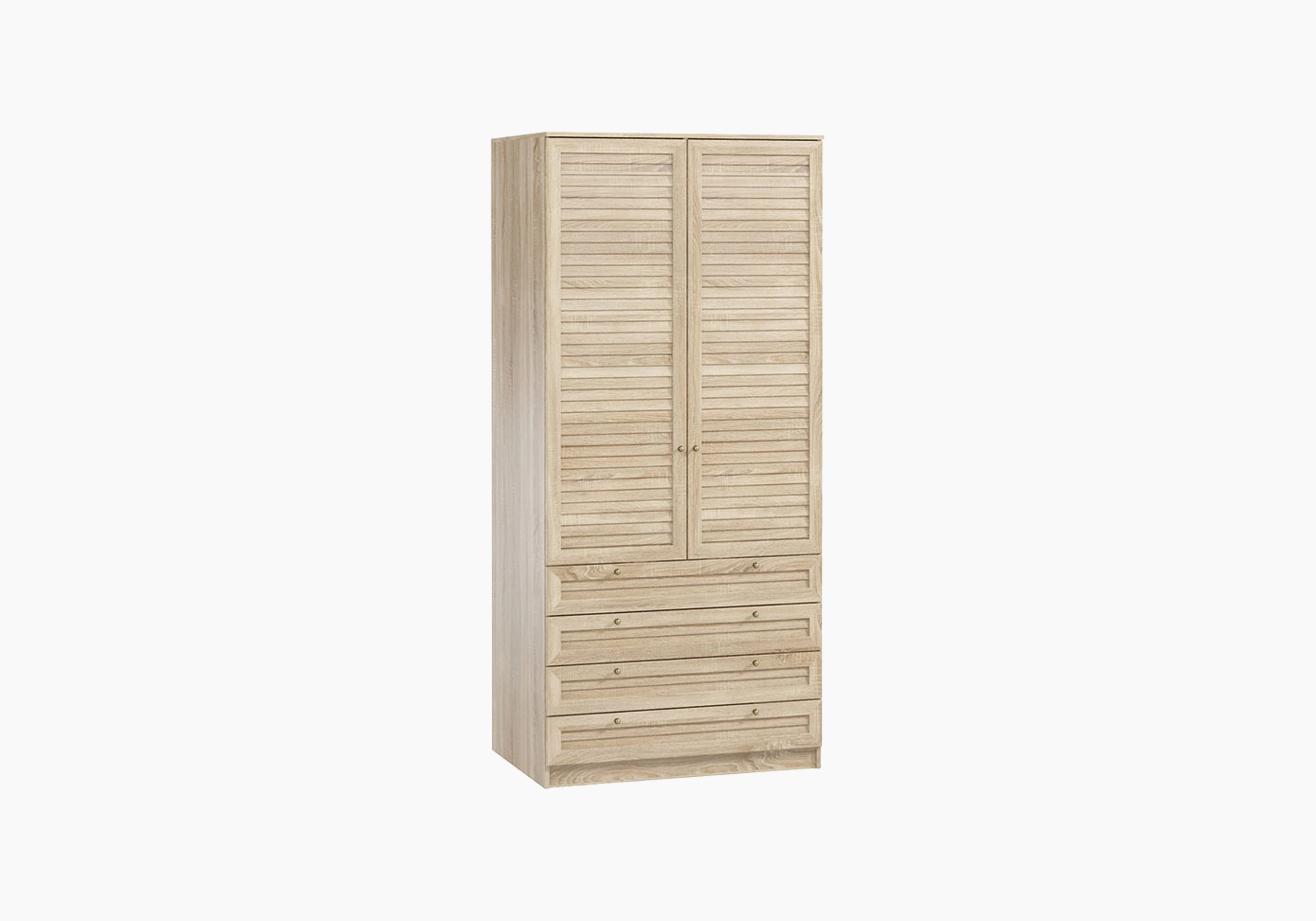 Внутри установлена металлическая штанга для вешалок и две верхние секции. Дополнительные четыре выдвижных ящика оснащены шариковыми направляющими. Закрытый цоколь предотвращает скопление пыли под шкафом и делает конструкцию более устойчивой.