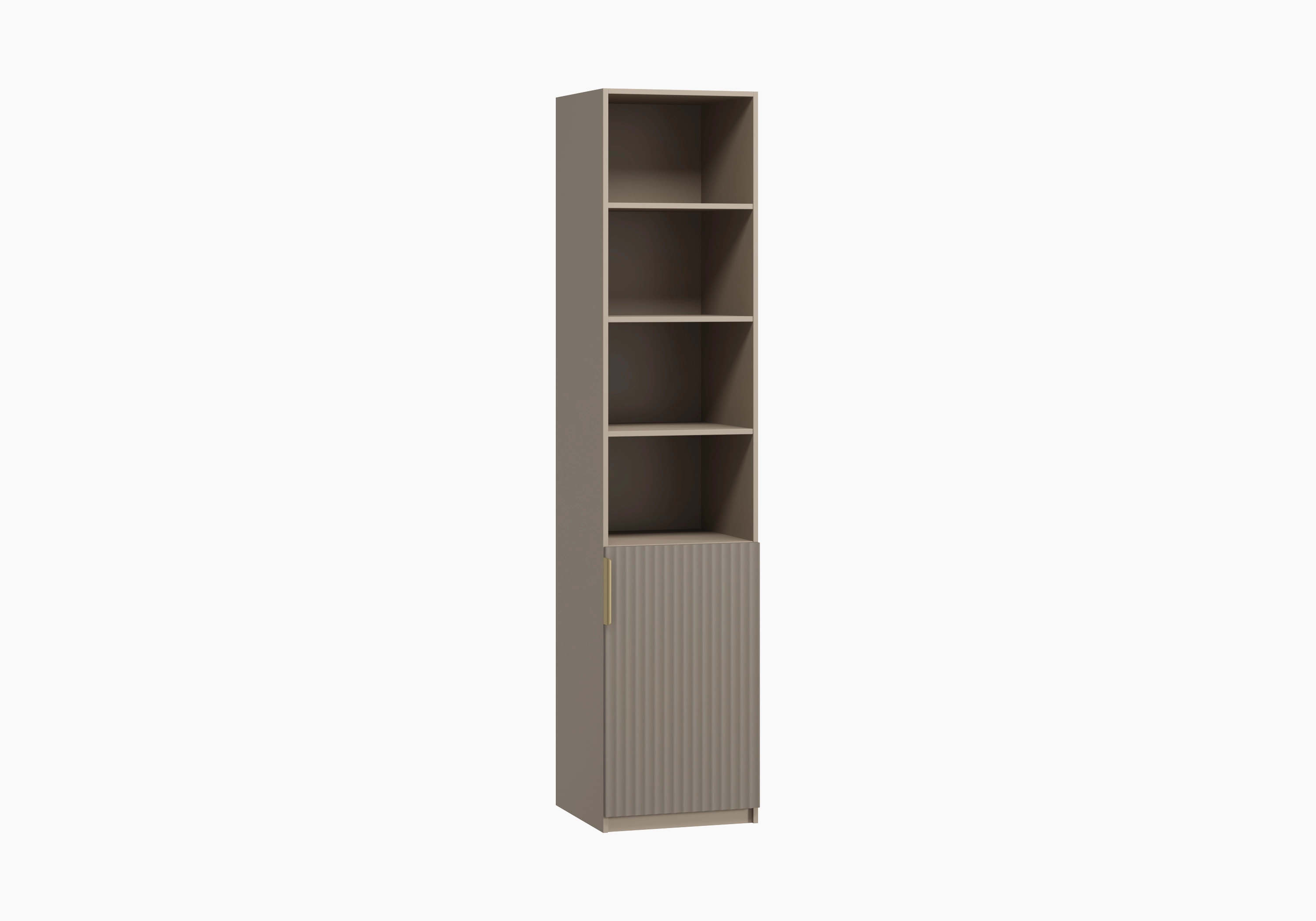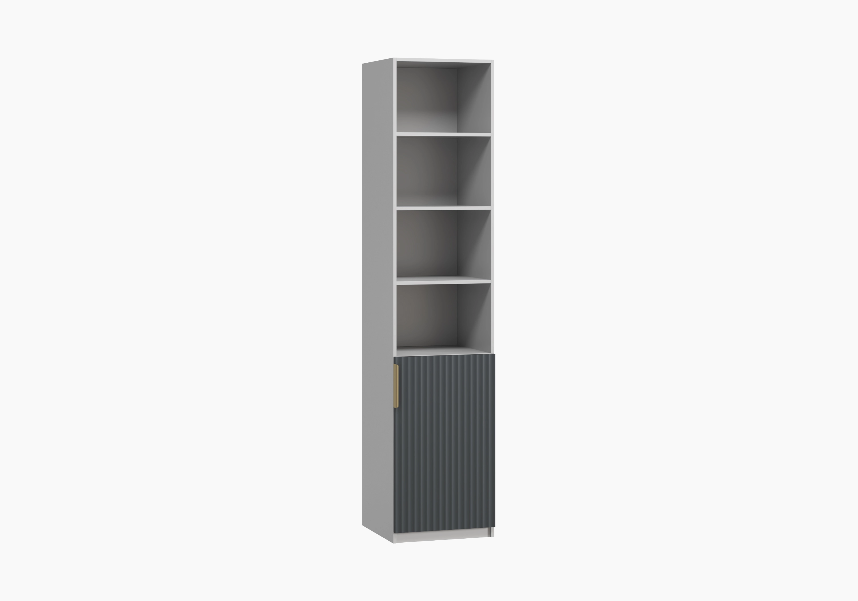 Металлическая ручка обеспечивает удобную эксплуатацию стеллажа. Лицевая фурнитура может быть выполнена в матовом черном, белом и золотом цвете. Волнистая фрезеровка МДФ-фасада создает контрасты света и тени.