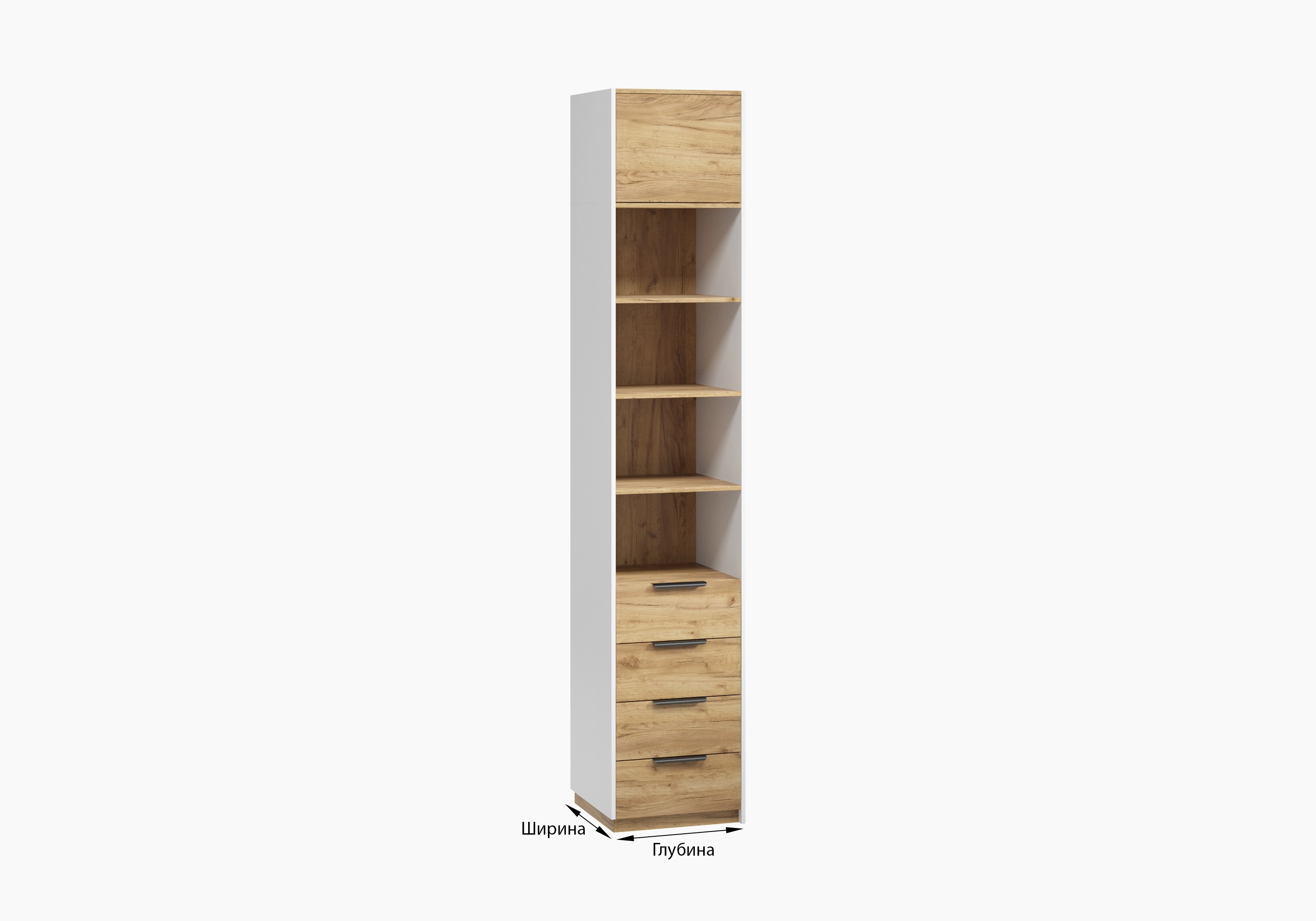 Торцевой комод Салленс с полками и антресолью предлагает компактное решение для организации узкого коридора или небольшой студии.