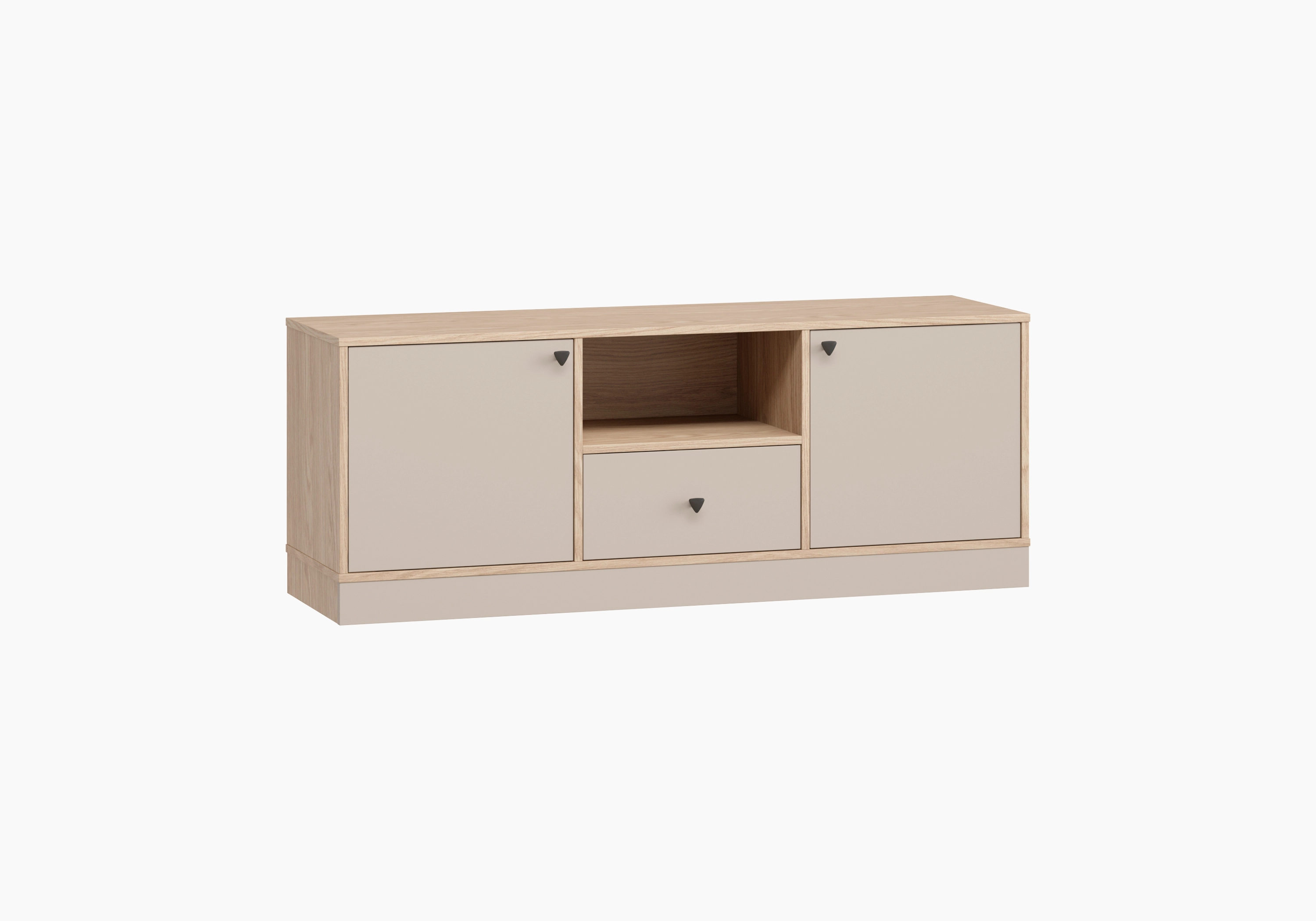 Выдвижной ящик оснащен шариковыми направляющими, которые способствуют бесшумному и плотному закрыванию. На верхней панели можно разместить телевизор и интерьерные украшения. Внутреннее пространство обеспечит достаточное количество места для зарядных устройств, книг и других мелочей. Скрытый цоколь упрощает уборку и делает мебель более устойчивой.